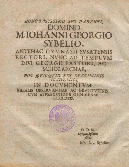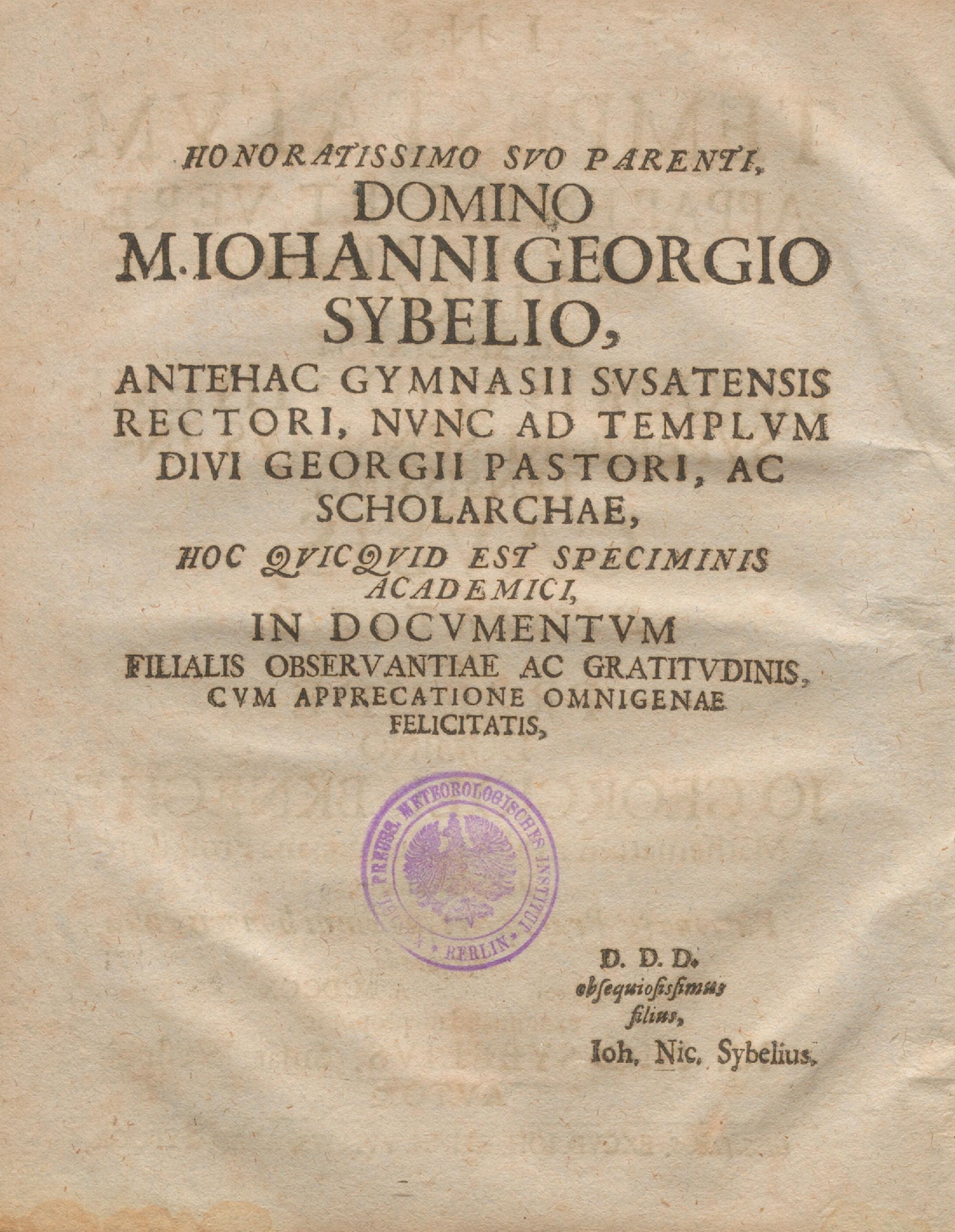De Tempestatvm Apparenter Et Vere Extraordinariarvm Ac Speciatim Frigoris qvod Hyeme Svperiori Sensimvs Intensissimi Cavsis, Dissertatio / Quam Praeside Domino Io. Georgio Liebknecht (Mathematum in alma Ludouiciana Professore). Publ. Ordinario, Patrono & Praeceptore suo omni honoris cultu prosequendo ad diem ... A. M.DCCX. examinandam proponit Io. Nic. Sybelivs, Susat. Westph. Avtor