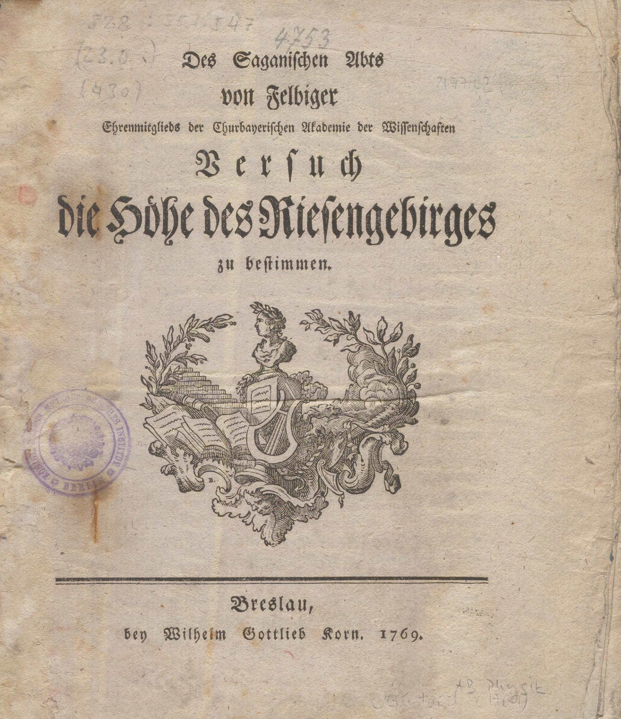 Des Saganischen Abts von Felbiger (Ehrenmitglieds der Churbayerischen Akademie der Wissenschaften) Versuch die Höhe des Riesengebirges zu bestimmen