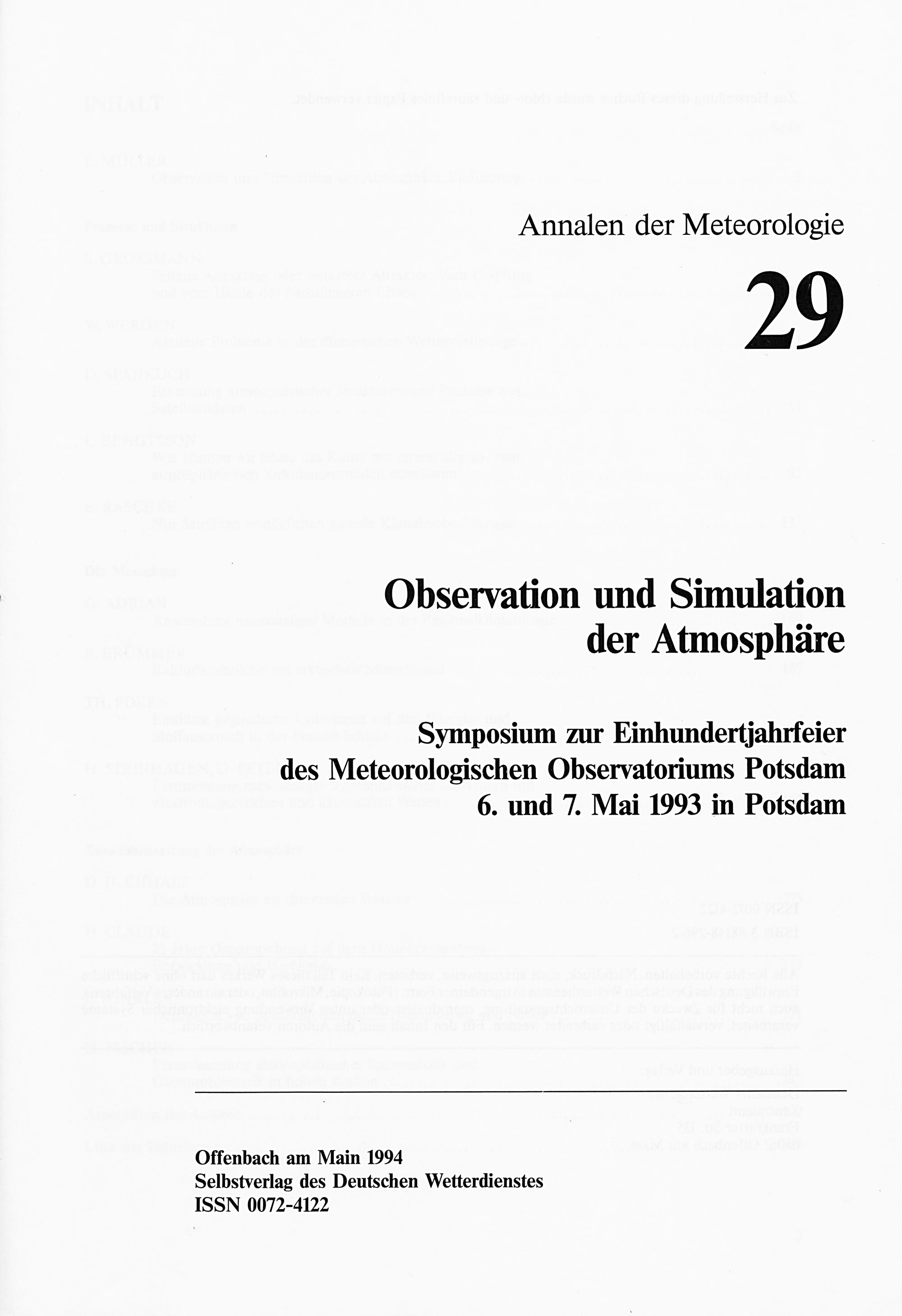 Observation und Simulation der Atmosphäre : Symposium zur Einhundertjahrfeier des Meteorologischen Observatoriums Potsdam, 6. und 7. Mai 1993 in Potsdam