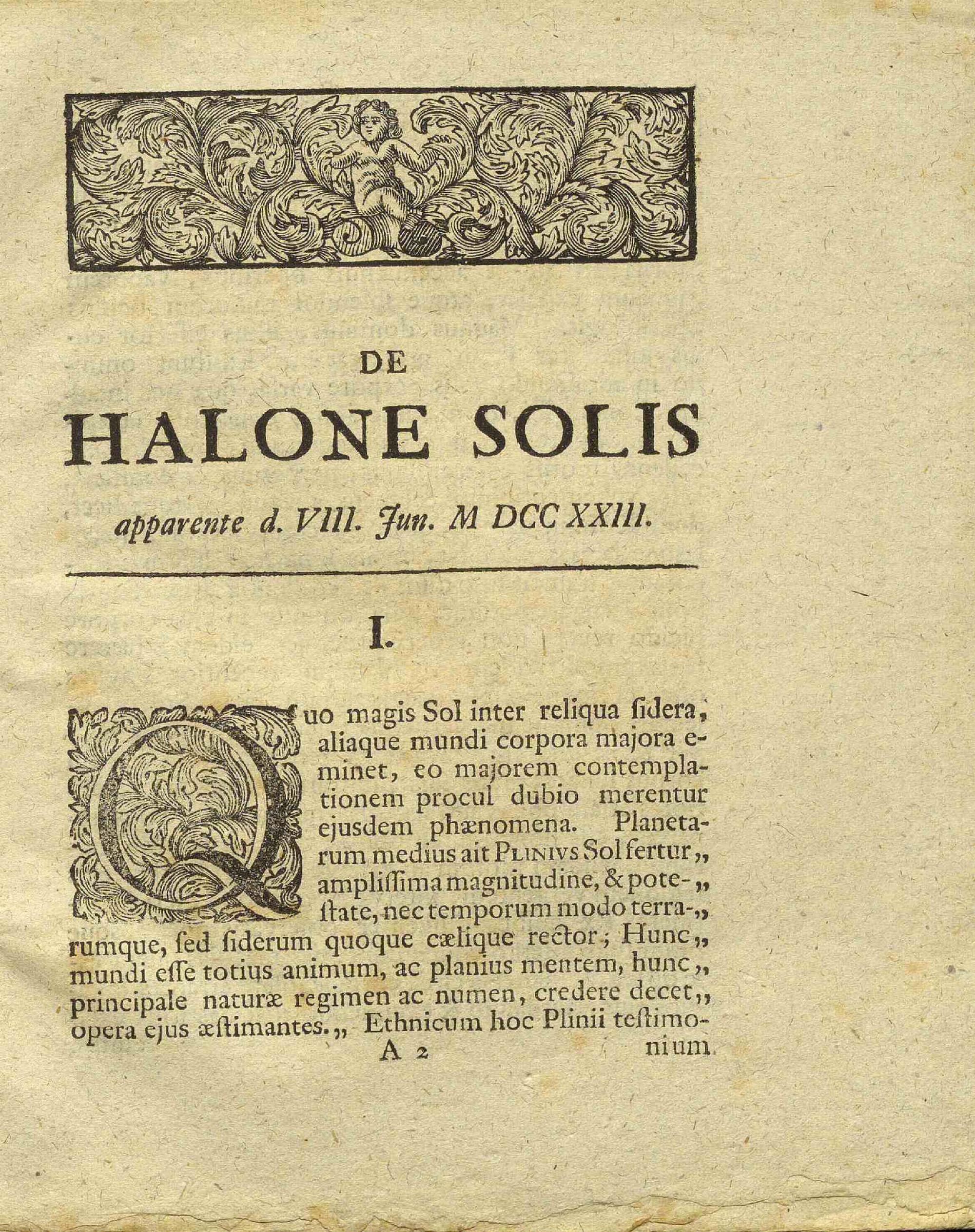 Dispvtatio Physica De Halone Solis (apparente d. VIII. Junii A. MDCCXXIII.) / Qvam Præside D. Mart. Gotthelff Loeschero Phys. Prof. Pvbl. Ord. Med. Extr. Nec Non Seren. Dvc. Saxo-Vinar. Phys. Prov., Pvblice Defendet M. Gottlob Liborivs Dathe Annab. Misn. Die XXIV. Febr. Anno cIɔ Iɔ ccXXV. In Avditorio Majori