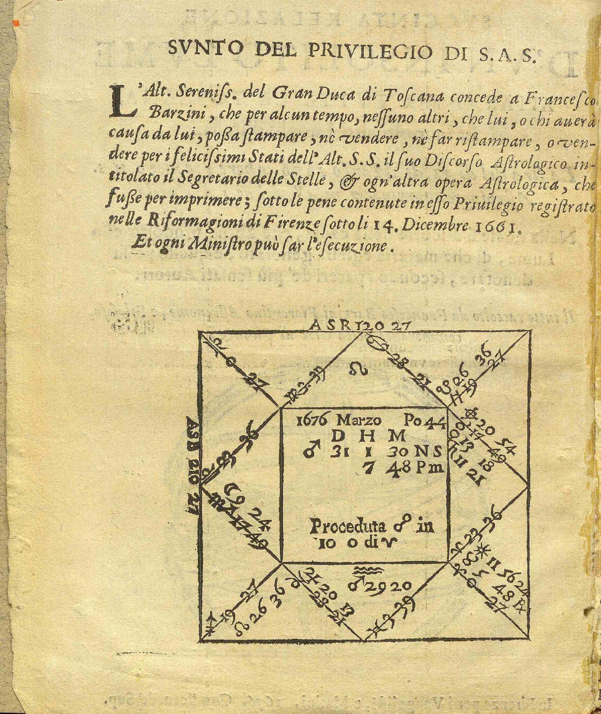 Svccinta Relazione D'Vn'Insolito Lvme Apparso Per Tvtta La Toscana, Et in molti altri Luoghi d'Italia : La sera del dì 31. MarZo 1676. a hore I. em.30.n.s. Astrologicamente h.7.m.48. del dì I. d'Arpile, Nella quale sie discorre della causa, che abbia prodotto esso Lume, di che materia egli sia generato, e quello possa denotare, secondo i pareri de' più sensati Autori / Il tutto raccolto da Francesco Barzini Fiorentino Astronome, e Filosofo, commorante nella città di Firenze