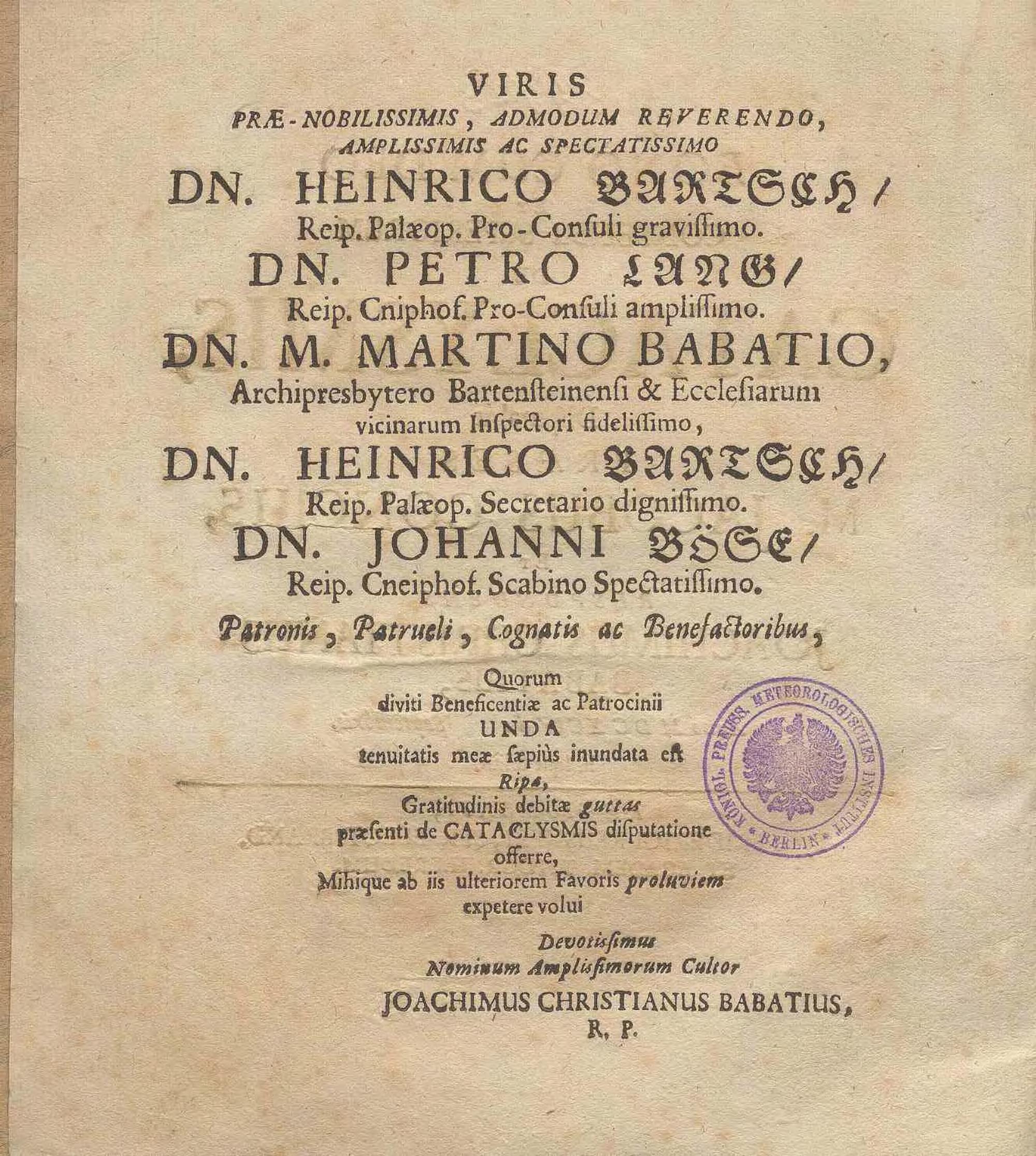 Bono Cum Deo Et Consensu Superiorum De Cataclysmis / Disputabit Præses M. Jacobus Concius, Et Respondens Joachimus Christianus Babatius