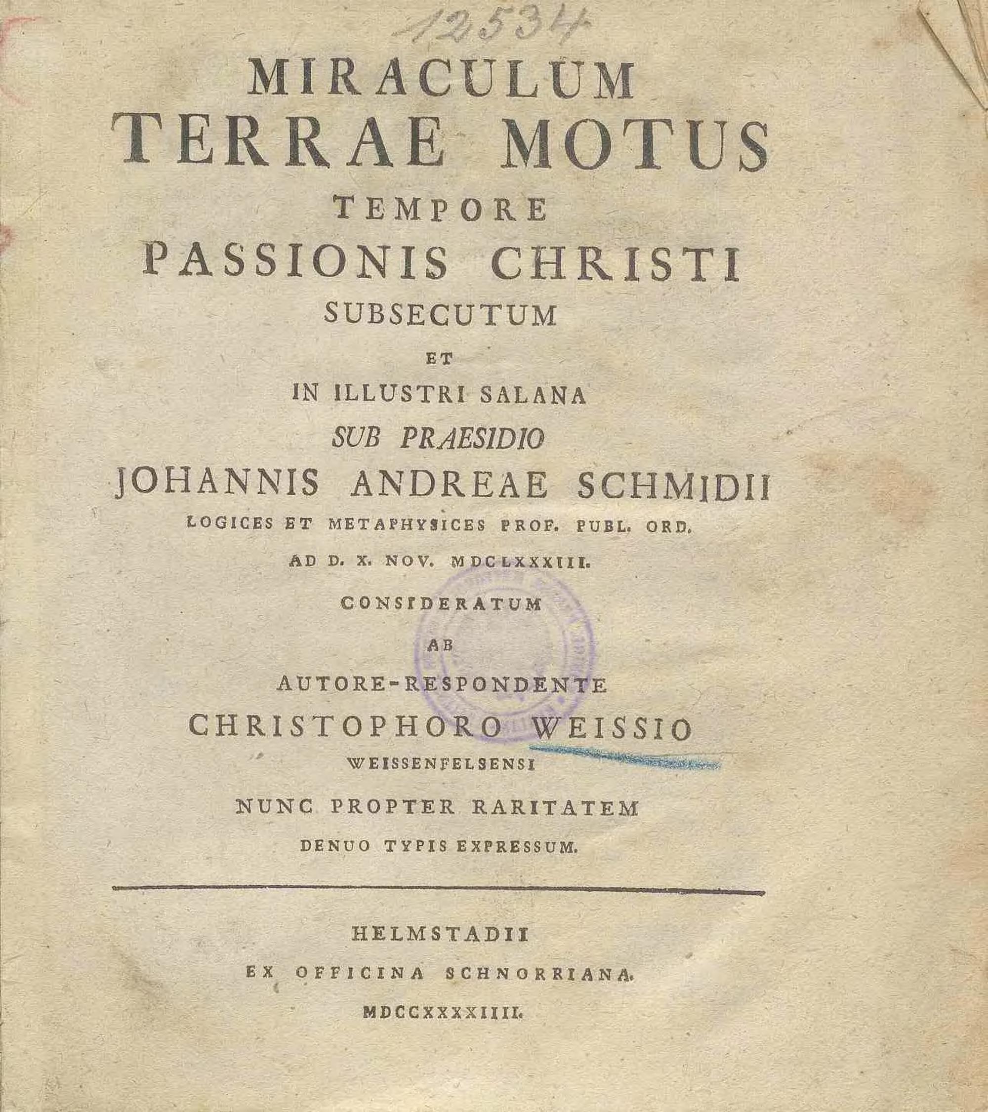 Miraculum Terrae Motus Tempore Passionis Christi Subsecutum : Et In Illustri Salana Sub Praesidio Johannis Andreae Schmidii, Logices Et Metaphysices Prof. Publ. Ord. Ad D. X. Nov. MDCLXXXIII. Consideratum Ab Autore-Respondente Christophoro Weissio Weissenfelsensi