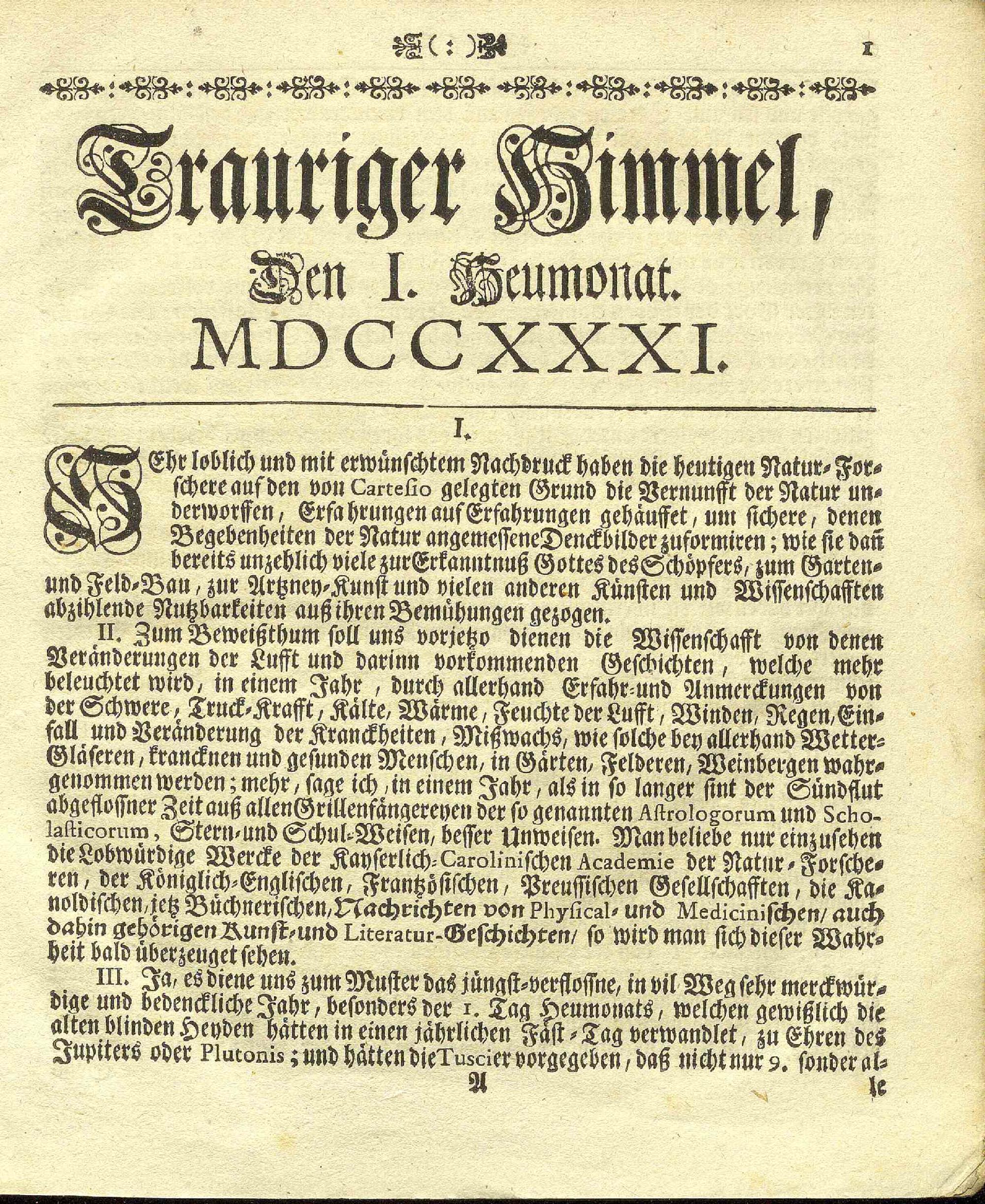 Beschreibung des Wetter-Jahrs MDCCXXXI : besonders aber des Traurigen Himmels der ob unseren Häubteren geschwebet, den I. Heumonat, auf die Erfahrung und Vernunfft gegründet / von Johann Jacob Scheuchtzer