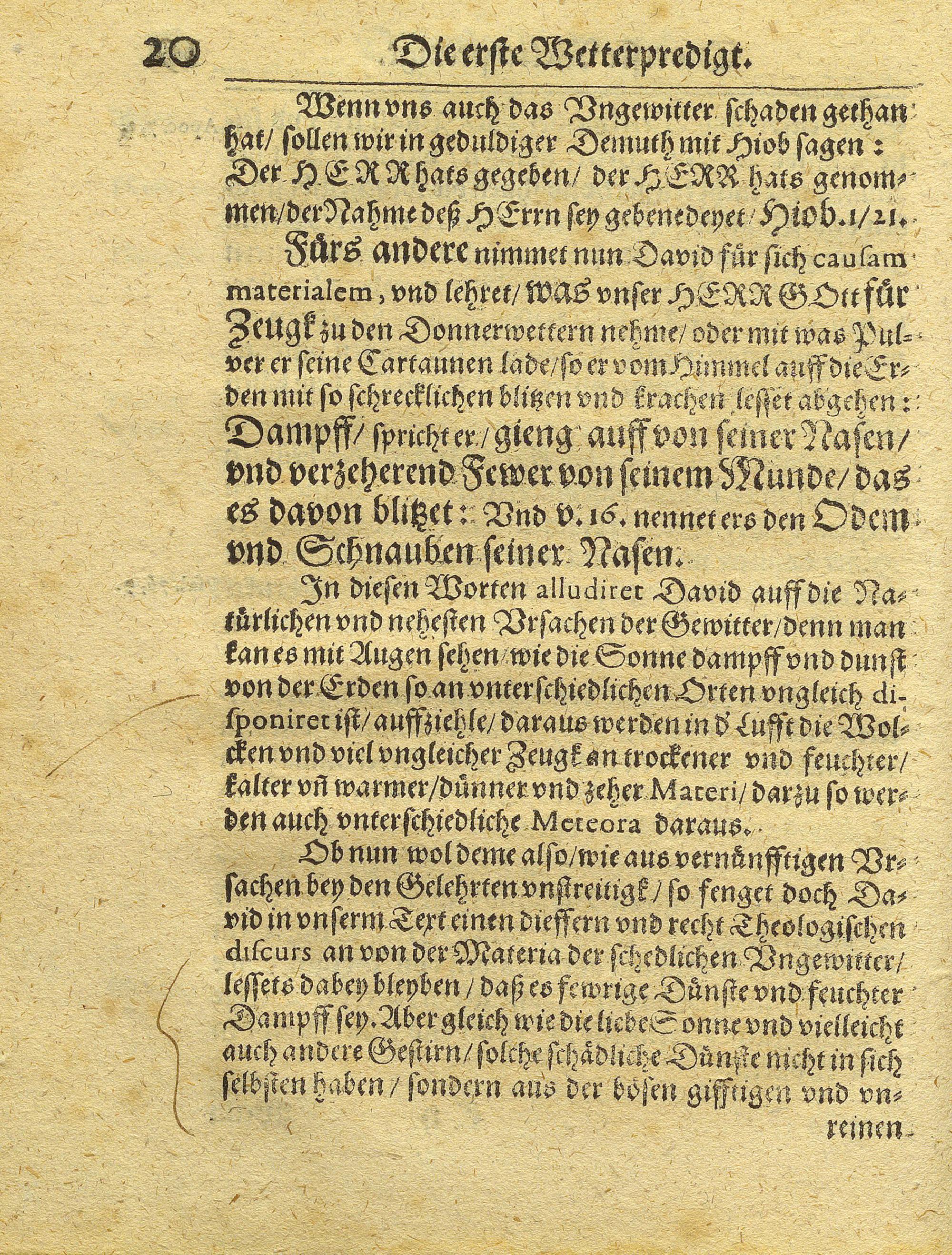 Zwo Wetterpredigten/ Auß dem 18. Psalm deß Königlichen Propheten Davids : Darinnen nicht allein die Ungewitter gründlich und eigentlich beschrieben werden/ sondern auch ermeltem Psalm anweisung geschicht/ wofür man dieselben halten/ und wie man sich darwider trösten solle. ; Bey Gelegenheit deß schrecklichen Ungewitters und der Thüringischen Sündflut/ welche zu Weimar und andern Orten in Thüringen am 29. Maji Sonnabend vor Trinitatis deß 1613. Jahrs grossen Schaden gethan : Gehalten zu Weymar in der Schloßkirchen, am 11. und 15. Junii, jetzterwehnten Jahrs / von Abraham Langen/ der H. Schrifft D.E.S. Hoffprediger und der Weimarischer Superintendentz verordneten Inspectore. Sampt angeheffter warhafftiger Relation/ Wie ubel diß grausame Ungewitter und Wasserflut/ an unterschiedlichen Orten haußgehalten ; Abraham Lange