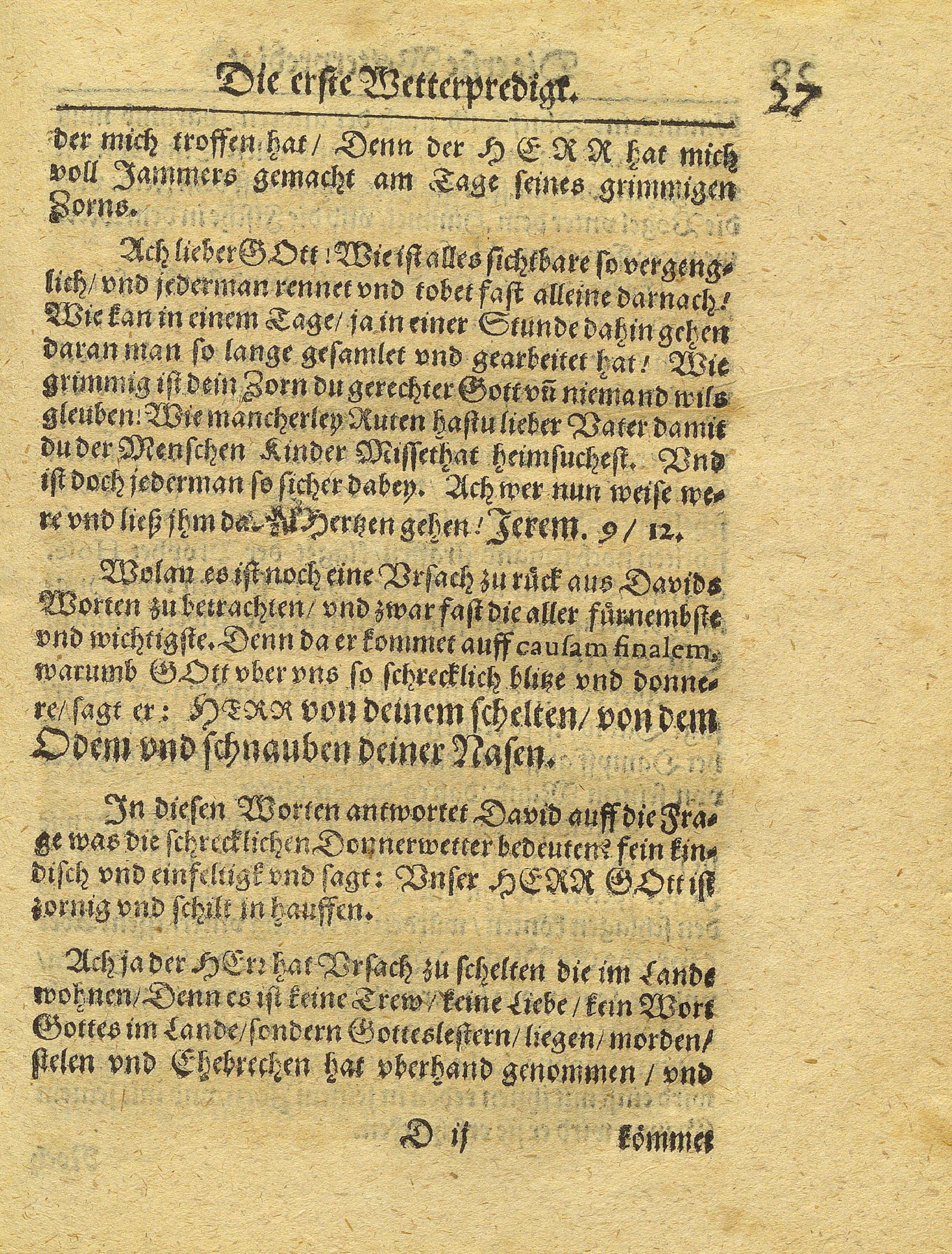 Zwo Wetterpredigten/ Auß dem 18. Psalm deß Königlichen Propheten Davids : Darinnen nicht allein die Ungewitter gründlich und eigentlich beschrieben werden/ sondern auch ermeltem Psalm anweisung geschicht/ wofür man dieselben halten/ und wie man sich darwider trösten solle. ; Bey Gelegenheit deß schrecklichen Ungewitters und der Thüringischen Sündflut/ welche zu Weimar und andern Orten in Thüringen am 29. Maji Sonnabend vor Trinitatis deß 1613. Jahrs grossen Schaden gethan : Gehalten zu Weymar in der Schloßkirchen, am 11. und 15. Junii, jetzterwehnten Jahrs / von Abraham Langen/ der H. Schrifft D.E.S. Hoffprediger und der Weimarischer Superintendentz verordneten Inspectore. Sampt angeheffter warhafftiger Relation/ Wie ubel diß grausame Ungewitter und Wasserflut/ an unterschiedlichen Orten haußgehalten ; Abraham Lange