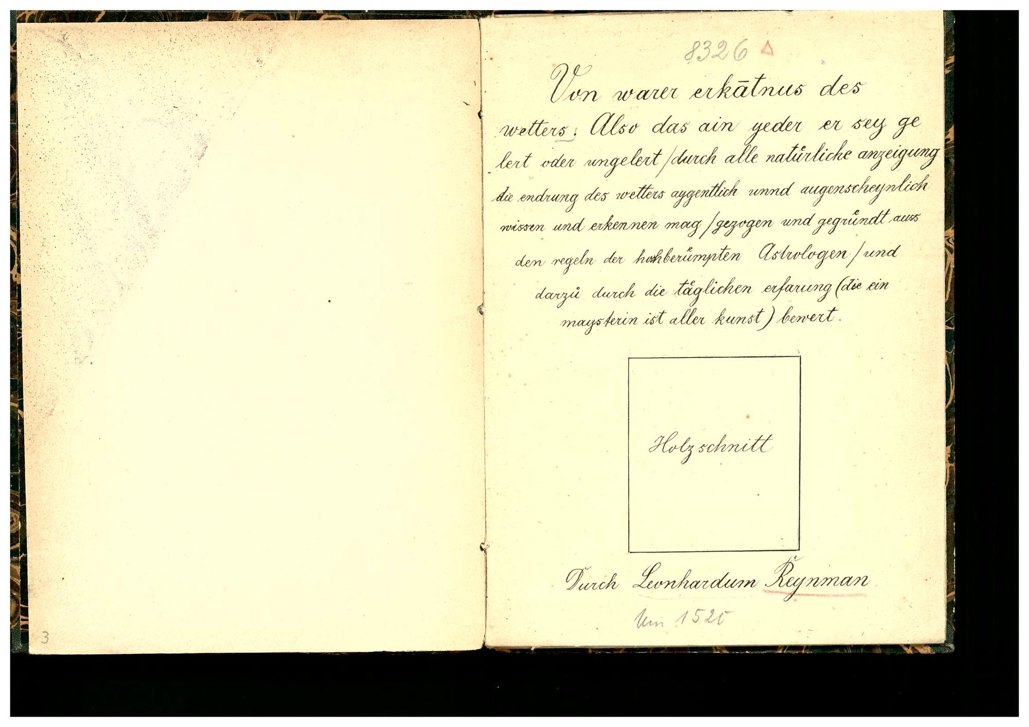 Von warer erkātnus des wetters : Also das ain yeder er sey gelert oder ungelert, durch alle natürliche anzeigung die endrung des wetters aygentlich unnd augenscheynlich wissen und erkennen mag, gezogen und gegründt auss den regeln der hohberühmpten Astrologen, und darzů durch die täglichen erfarung (die ein maysterin ist aller kunst) bewert / Durch Leonhardum Reynman