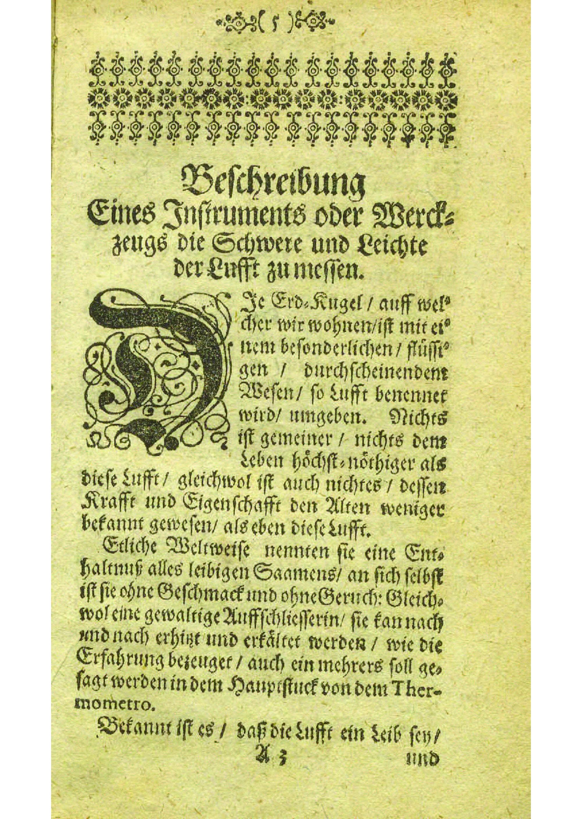 1 (1697) Worinnen vermittels drey sonderbahrer Instrumenten/ Durch wunderbahre Würckung Der Natur und Kunst/ I. Die Schwäre und Leichte/ II. Die Truckene und Feuchte/ III. Das Ab- und Zunehmen der Hitz und Kälte Der Lufft zu erkennen seynd : Allen Kunst-begierigen und Herrn Medicis zur Lieb und Nutzbarkeit auffgesetzt/ Und mit hierzu dienlichen Kupffer-Figuren geziehret