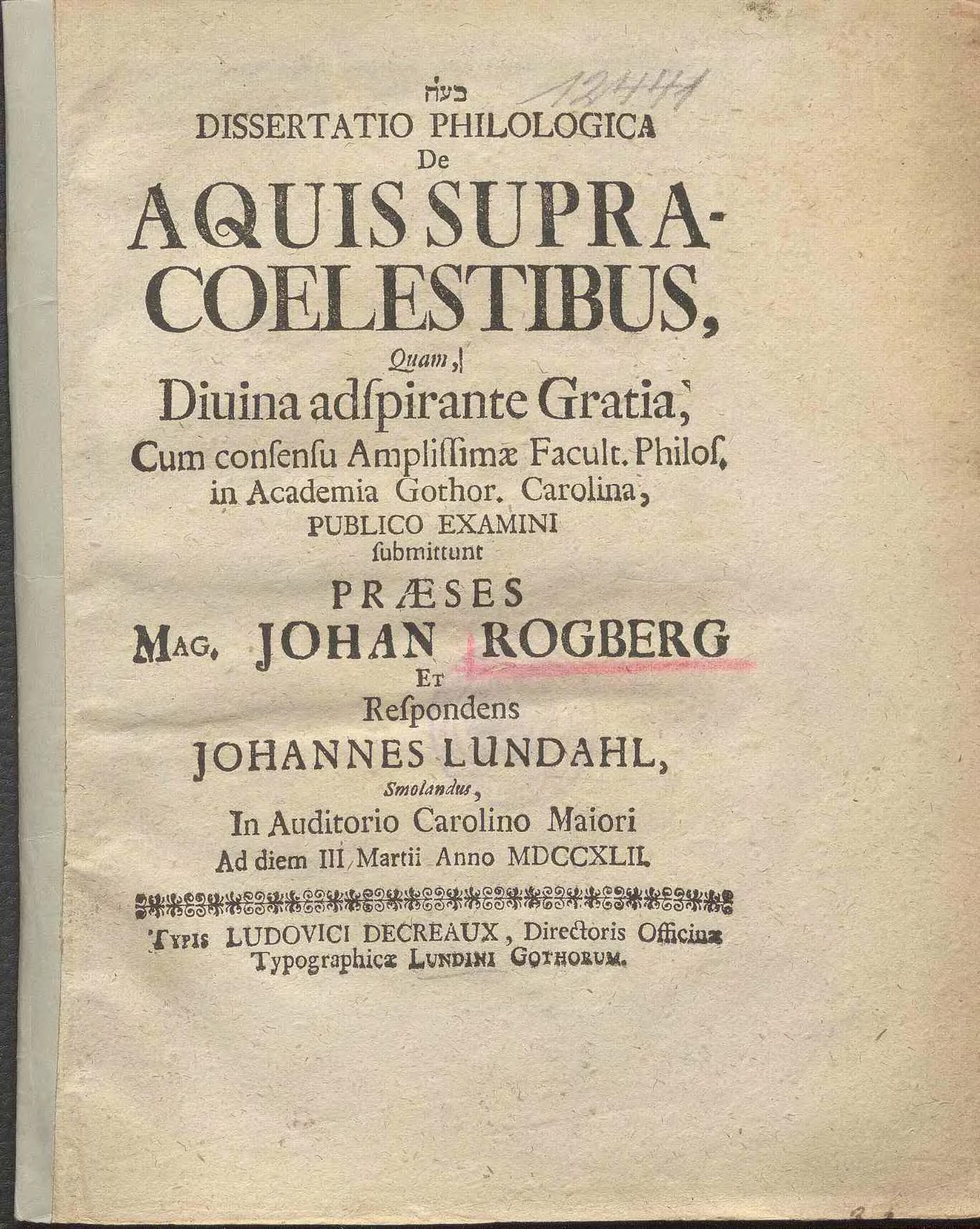 Dissertatio Philologica De Aquis Supracoelestibus / Quam,|Diuina adspirante Gratia, Cum consensu Amplissimæ Facult. Philos. in Academia Gothor. Carolina, Publico Examini submittunt Præses Mag. Johan Rogberg Et Respondens Johannes Lundahl, Smolandus