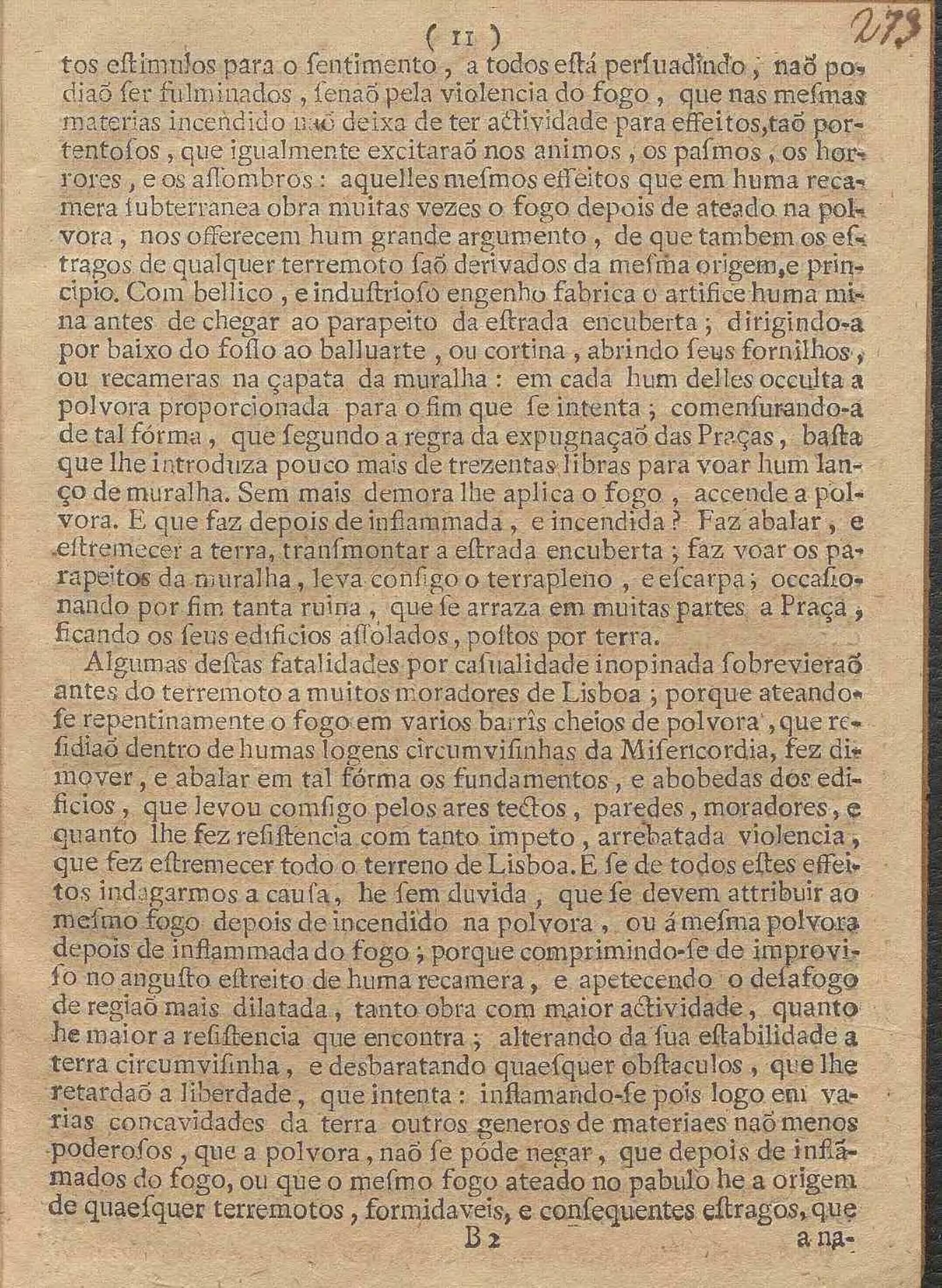 Nova Instrucc, Am Filosofica, Estabelecida Em Varios Experimentos, systemas, e observaçoens pertencentes á Mathematica, principalmente A Artilheria, astrologia, Metheoros, E Musica, em que evidentemente se demostra, que os tres elementos do Fogo, do Ar, e da Agca saõ as causas principaes, que dimovem as convulsoens, e tremores da terra; e tratando dos dous terremotos, que se experimentaraõ em Lisboa, do primeiro do mez de Novembro, do segundo de Março proximo : Expende As Particulares Razoens Da Mayor Intenc, Am e extençaõ de espaço, que abrangeo o primeiro, da circunstancia do ruido, e estrondo, de succeder de manhaã pela conjuçaõ do meyo dia, e no mez de Março, infringindo por ultimo a fé, e o credito, que o vulgo costuma tributar aos Prognosticos, que fazem os Reportorios de quaesquer Terrmotos futuros / Por Fr. Francisco De Vasconcellos E Sande Corte Real, Freire Professo na Ordem Militar de S. Bento de Aviz, Mestre em Artes, e Doutor na Sagrada Theologia