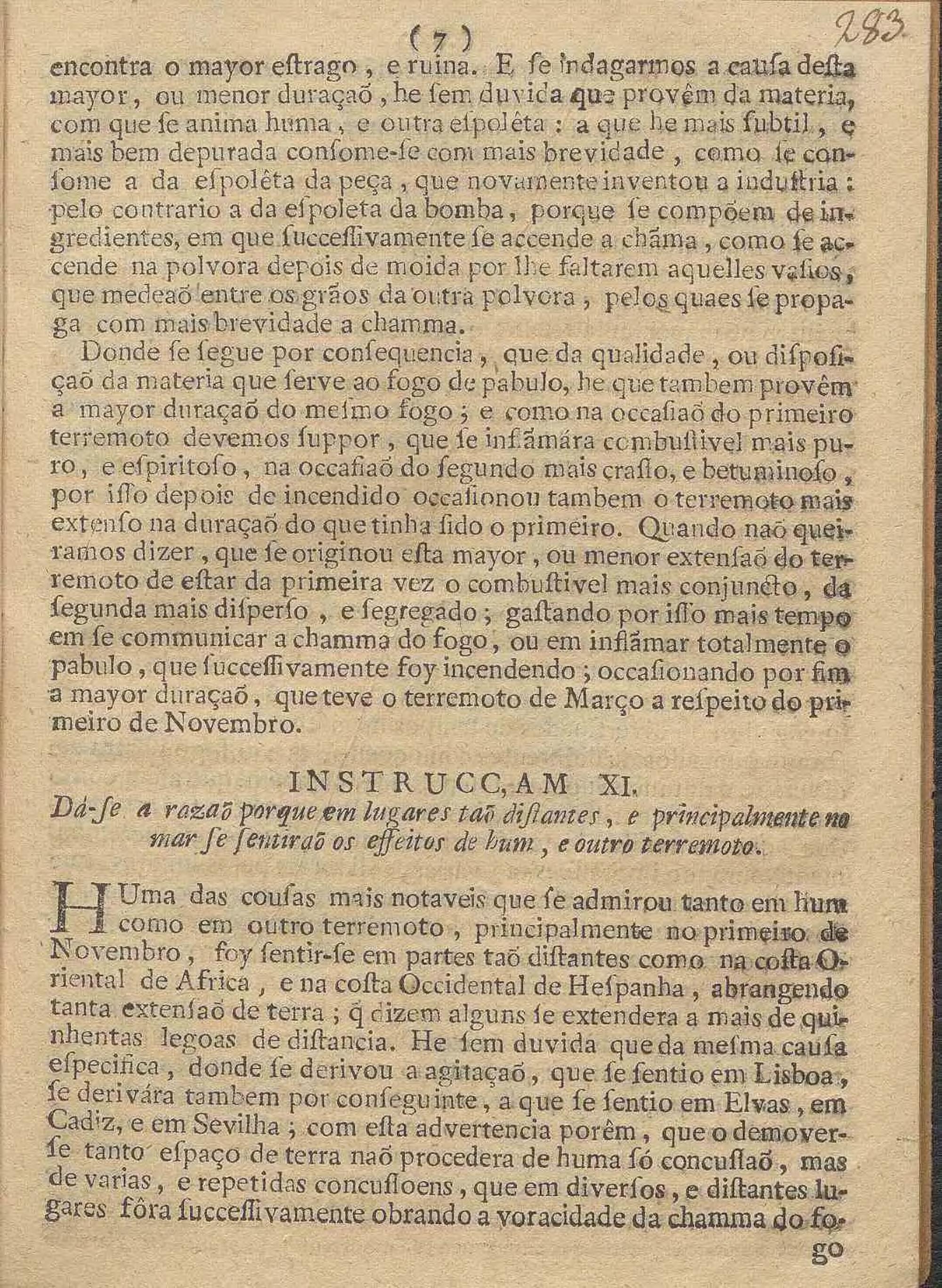 Nova Instrucc, Am Filosofica, Estabelecida Em Varios Experimentos, systemas, e observaçoens pertencentes á Mathematica, principalmente A Artilheria, astrologia, Metheoros, E Musica, em que evidentemente se demostra, que os tres elementos do Fogo, do Ar, e da Agca saõ as causas principaes, que dimovem as convulsoens, e tremores da terra; e tratando dos dous terremotos, que se experimentaraõ em Lisboa, do primeiro do mez de Novembro, do segundo de Março proximo : Expende As Particulares Razoens Da Mayor Intenc, Am e extençaõ de espaço, que abrangeo o primeiro, da circunstancia do ruido, e estrondo, de succeder de manhaã pela conjuçaõ do meyo dia, e no mez de Março, infringindo por ultimo a fé, e o credito, que o vulgo costuma tributar aos Prognosticos, que fazem os Reportorios de quaesquer Terrmotos futuros / Por Fr. Francisco De Vasconcellos E Sande Corte Real, Freire Professo na Ordem Militar de S. Bento de Aviz, Mestre em Artes, e Doutor na Sagrada Theologia
