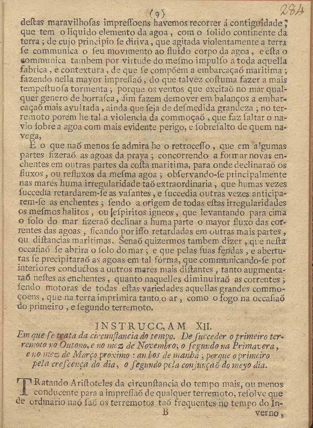 Nova Instrucc, Am Filosofica, Estabelecida Em Varios Experimentos, systemas, e observaçoens pertencentes á Mathematica, principalmente A Artilheria, astrologia, Metheoros, E Musica, em que evidentemente se demostra, que os tres elementos do Fogo, do Ar, e da Agca saõ as causas principaes, que dimovem as convulsoens, e tremores da terra; e tratando dos dous terremotos, que se experimentaraõ em Lisboa, do primeiro do mez de Novembro, do segundo de Março proximo : Expende As Particulares Razoens Da Mayor Intenc, Am e extençaõ de espaço, que abrangeo o primeiro, da circunstancia do ruido, e estrondo, de succeder de manhaã pela conjuçaõ do meyo dia, e no mez de Março, infringindo por ultimo a fé, e o credito, que o vulgo costuma tributar aos Prognosticos, que fazem os Reportorios de quaesquer Terrmotos futuros / Por Fr. Francisco De Vasconcellos E Sande Corte Real, Freire Professo na Ordem Militar de S. Bento de Aviz, Mestre em Artes, e Doutor na Sagrada Theologia