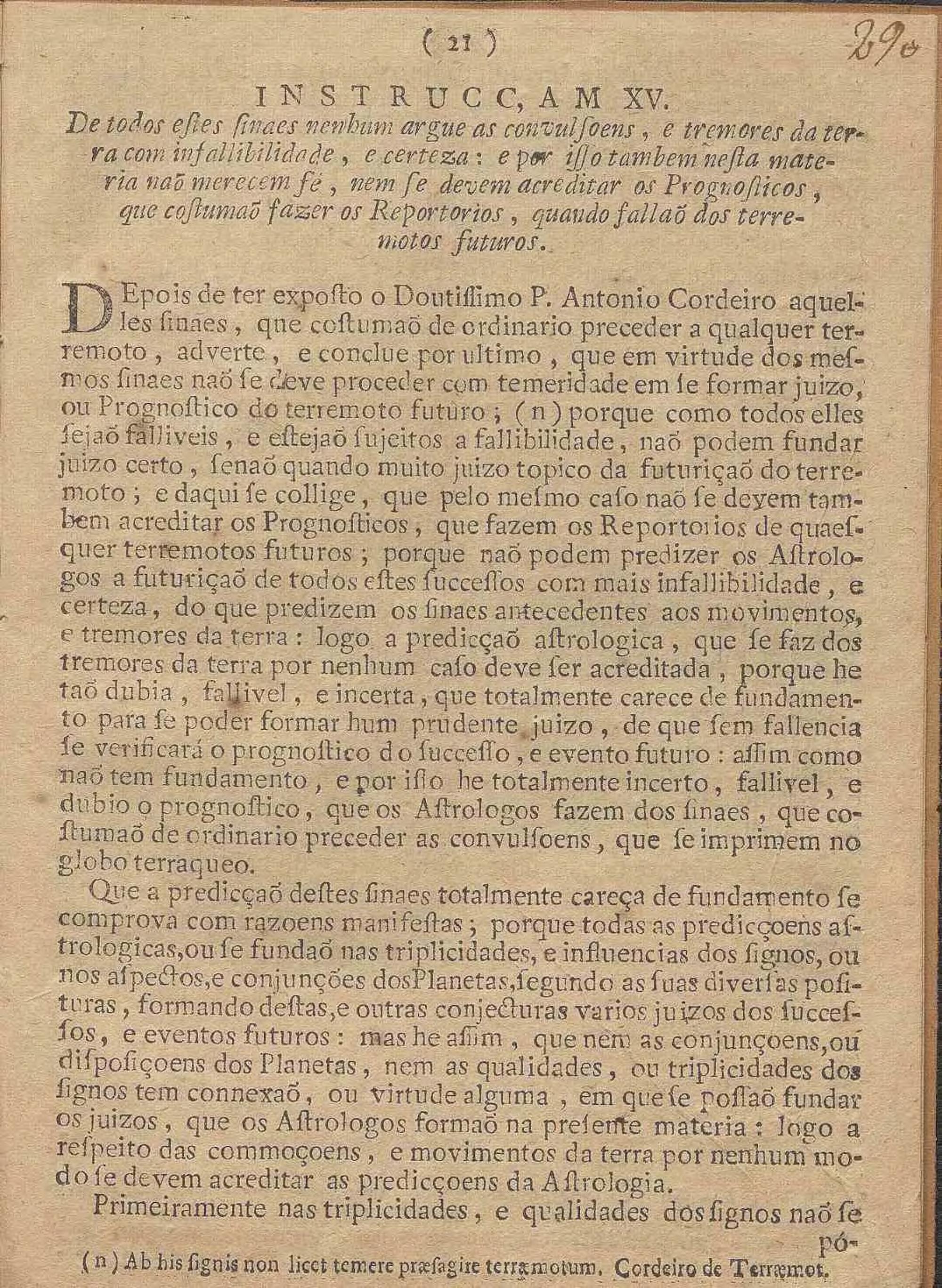 Nova Instrucc, Am Filosofica, Estabelecida Em Varios Experimentos, systemas, e observaçoens pertencentes á Mathematica, principalmente A Artilheria, astrologia, Metheoros, E Musica, em que evidentemente se demostra, que os tres elementos do Fogo, do Ar, e da Agca saõ as causas principaes, que dimovem as convulsoens, e tremores da terra; e tratando dos dous terremotos, que se experimentaraõ em Lisboa, do primeiro do mez de Novembro, do segundo de Março proximo : Expende As Particulares Razoens Da Mayor Intenc, Am e extençaõ de espaço, que abrangeo o primeiro, da circunstancia do ruido, e estrondo, de succeder de manhaã pela conjuçaõ do meyo dia, e no mez de Março, infringindo por ultimo a fé, e o credito, que o vulgo costuma tributar aos Prognosticos, que fazem os Reportorios de quaesquer Terrmotos futuros / Por Fr. Francisco De Vasconcellos E Sande Corte Real, Freire Professo na Ordem Militar de S. Bento de Aviz, Mestre em Artes, e Doutor na Sagrada Theologia