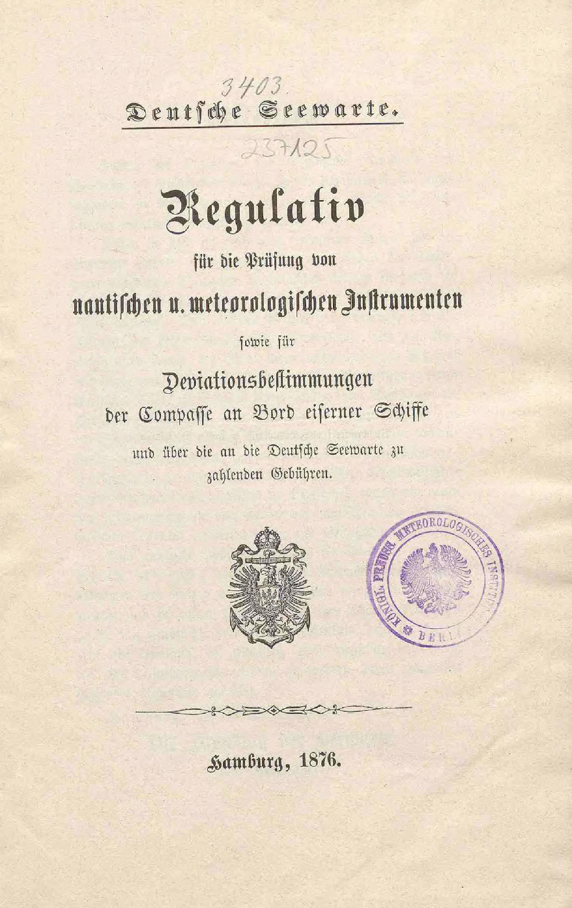 Regulativ für die Prüfung von nautischen u. meteorologischen Instrumenten sowie für Deviationsbestimmungen der Compasse an Bord eiserner Schiffe und über die an die Deutsche Seewarte zu zahlenden Gebühren / Deutsche Seewarte