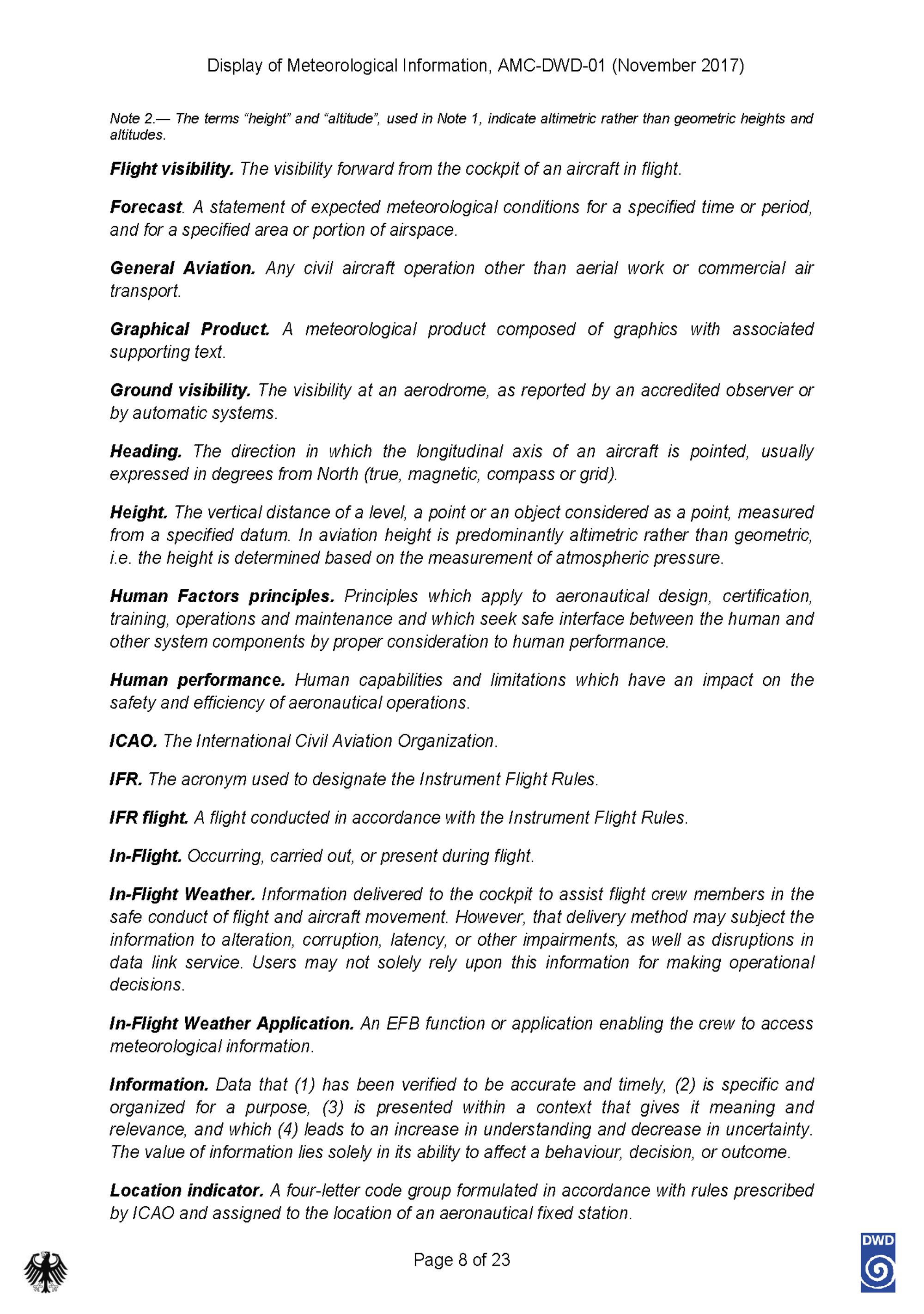 Display of meteorological information : acceptable means of compliance for display of digital meteorological information ‒ AMC-DWD-01 / Published by / Herausgeber: Deutscher Wetterdienst – Abteilung Flugmeteorologie, Bundesoberbehörde des Bundesministeriums für Verkehr und digitale Infrastruktur