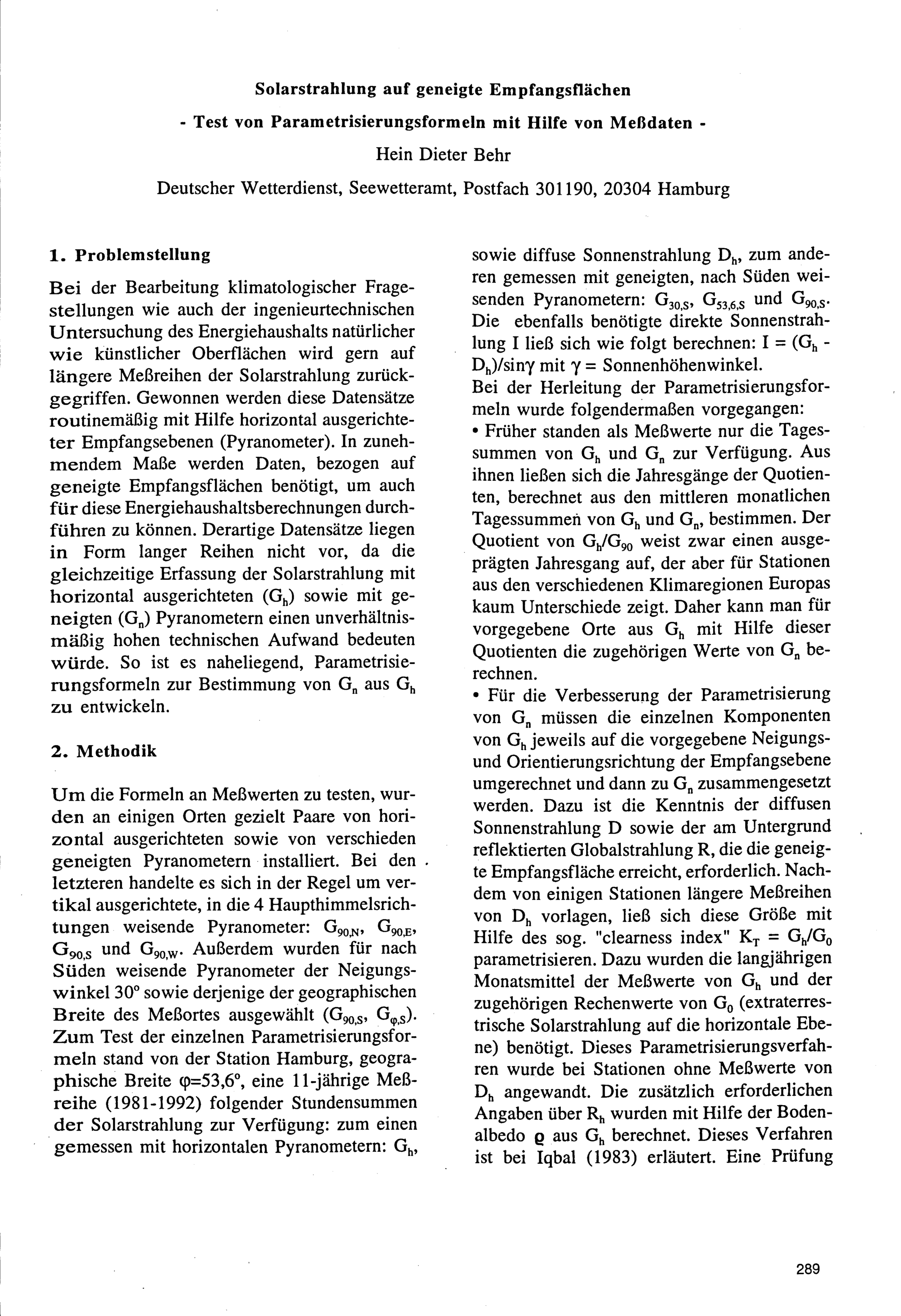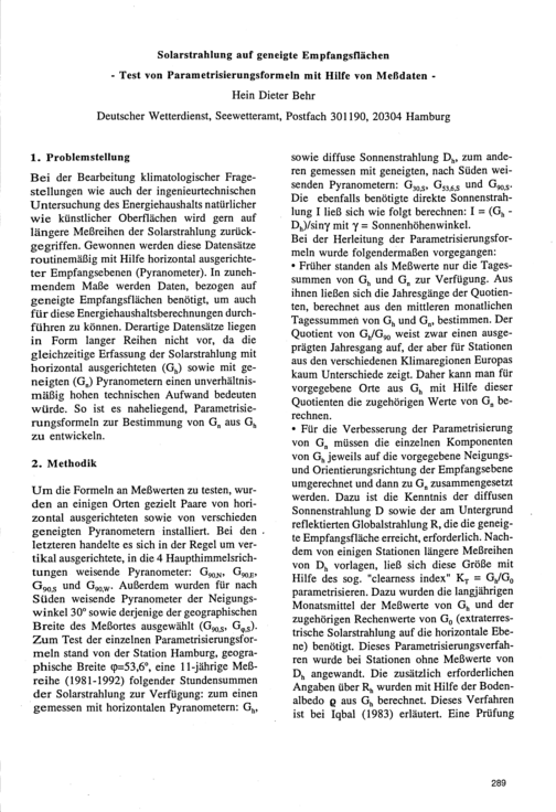 Solarstrahlung auf geneigte Empfangsflächen - Test von Parameterisierungsformeln mit Hilfe von Meßdaten
