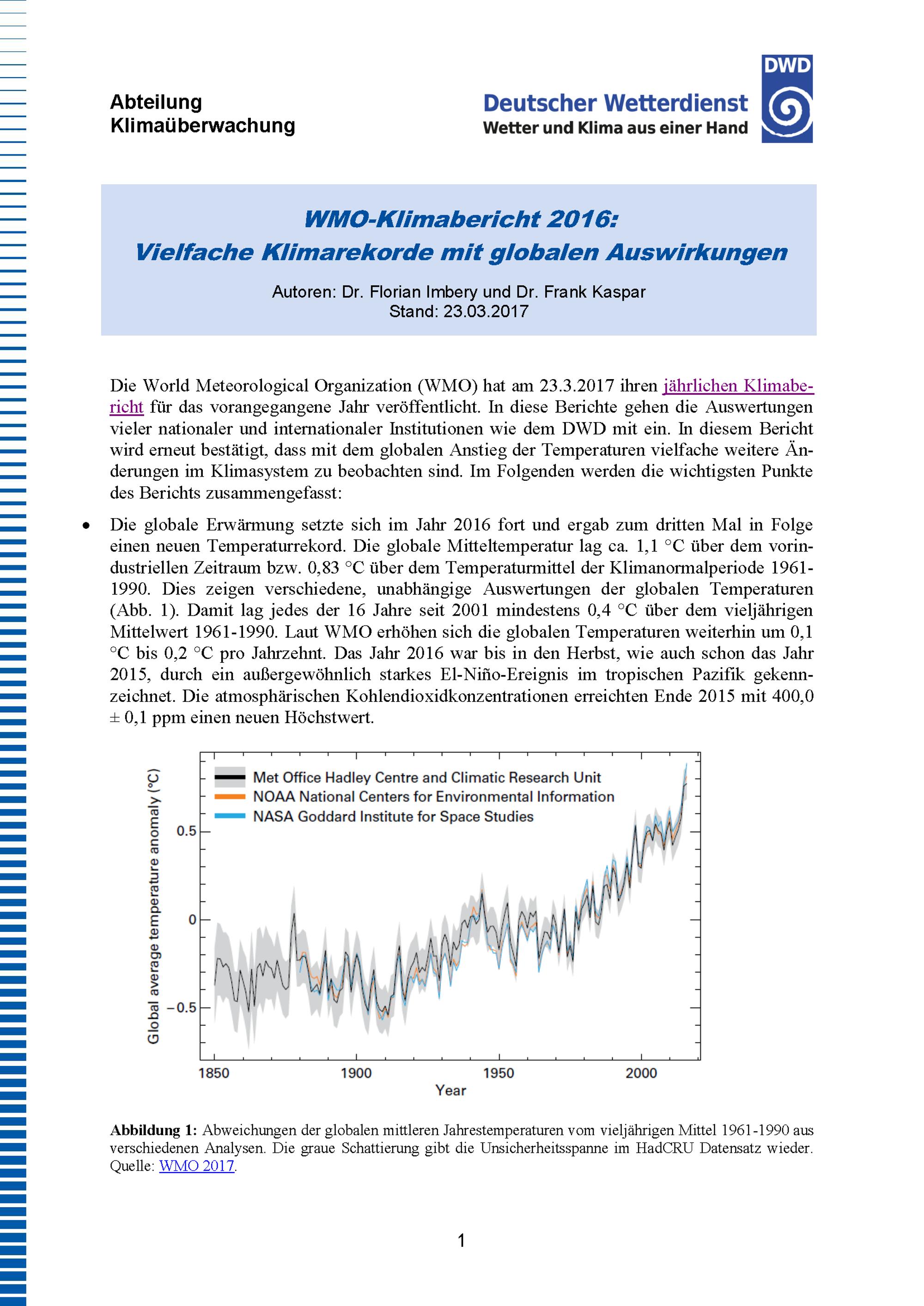 WMO-Klimabericht 2016: Vielfache Klimarekorde mit globalen Auswirkungen / Autoren: Dr. Florian Imbery und Dr. Frank Kaspar