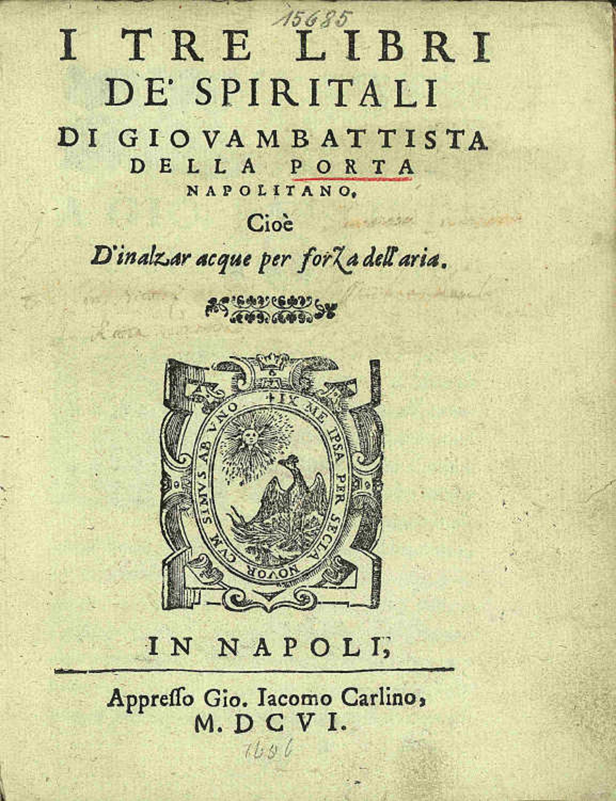 I Tre Libri De' Spiritali Di Giovambattista Della Porta Napolitano : Cioe D'inalzar acque per forza dell'aria / Di Giovam Battista Della Porta