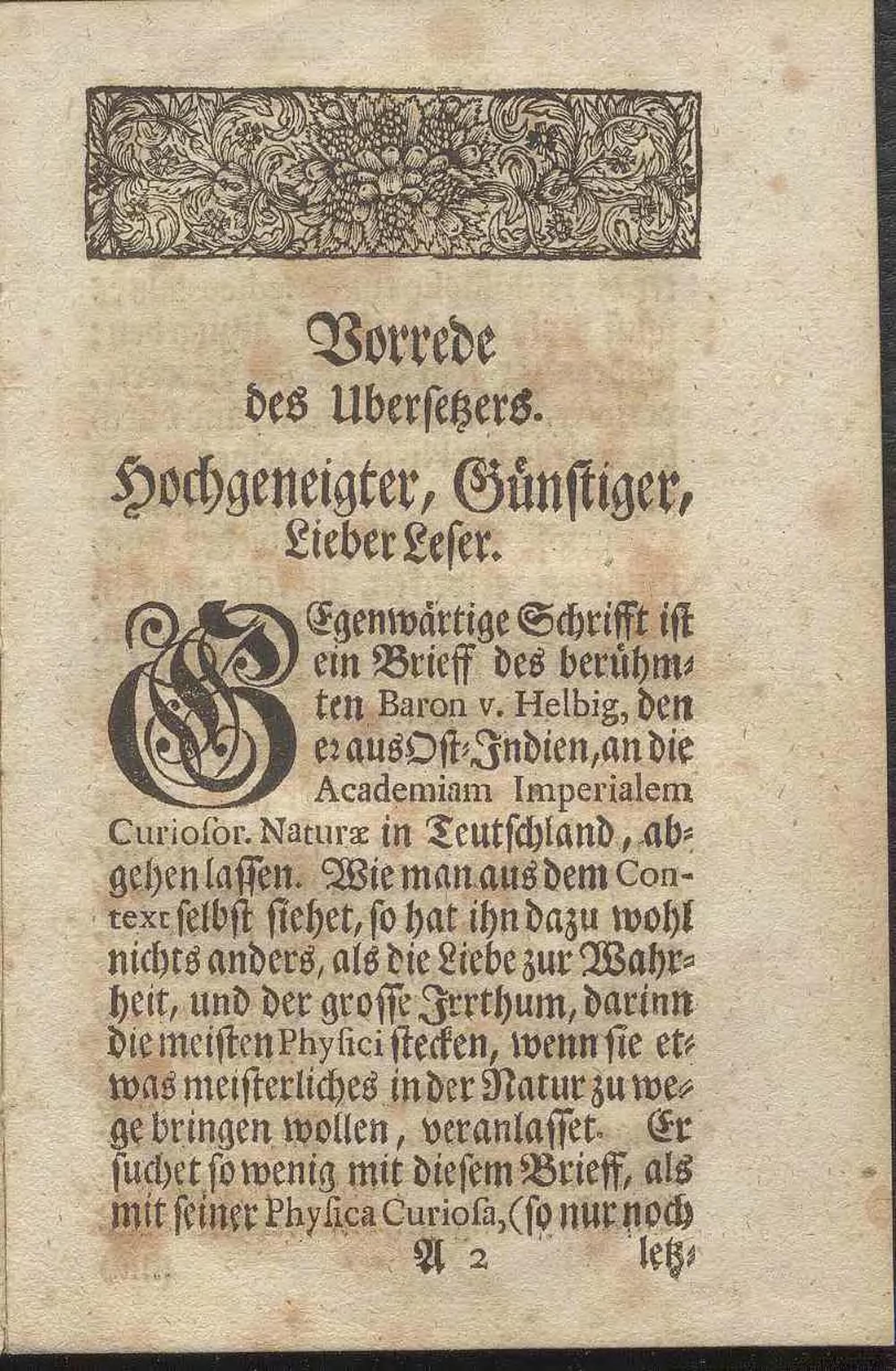 Ioh. Otton. Helbigii, Thuringi Philosophi und Medicinæ Doctoris Introitus In Veram Atque Inauditam Physicam, das ist: Eingang zur wahrhafften und nie erhörten Physic : eröffnet in einem Brief aus dem Morgenländischen Indien nach Europam, an des Heil. Röm. Reichs weitberühmte Academie derer Curiosorum Naturae gesand / Ins Hochteutsche übersetzt im Monat December 1716 von F.S.V.D.M.C.
