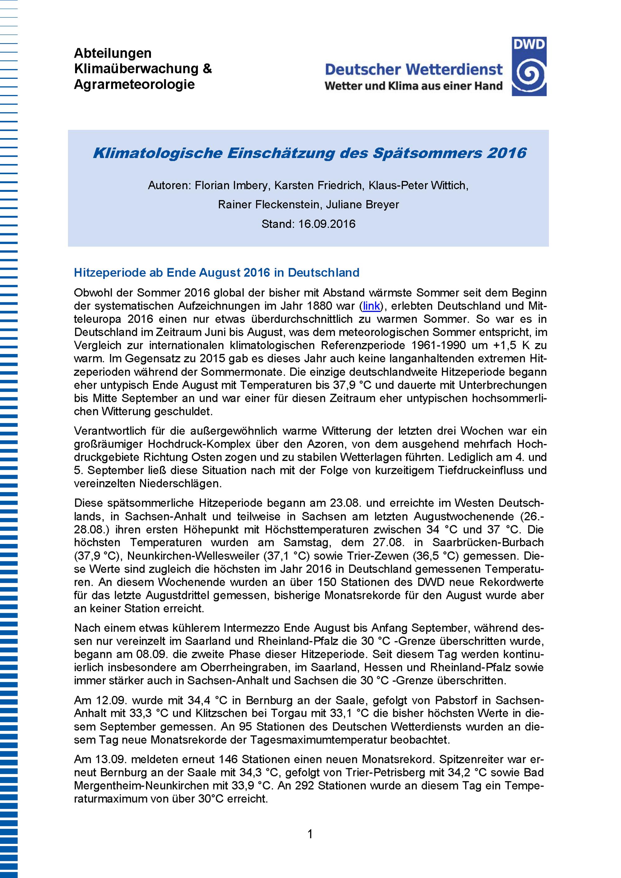 Klimatologische Einschätzung des Spätsommers 2016 / Autoren: Florian Imbery, Karsten Friedrich, Klaus-Peter Wittich, Rainer Fleckenstein, Juliane Breyer