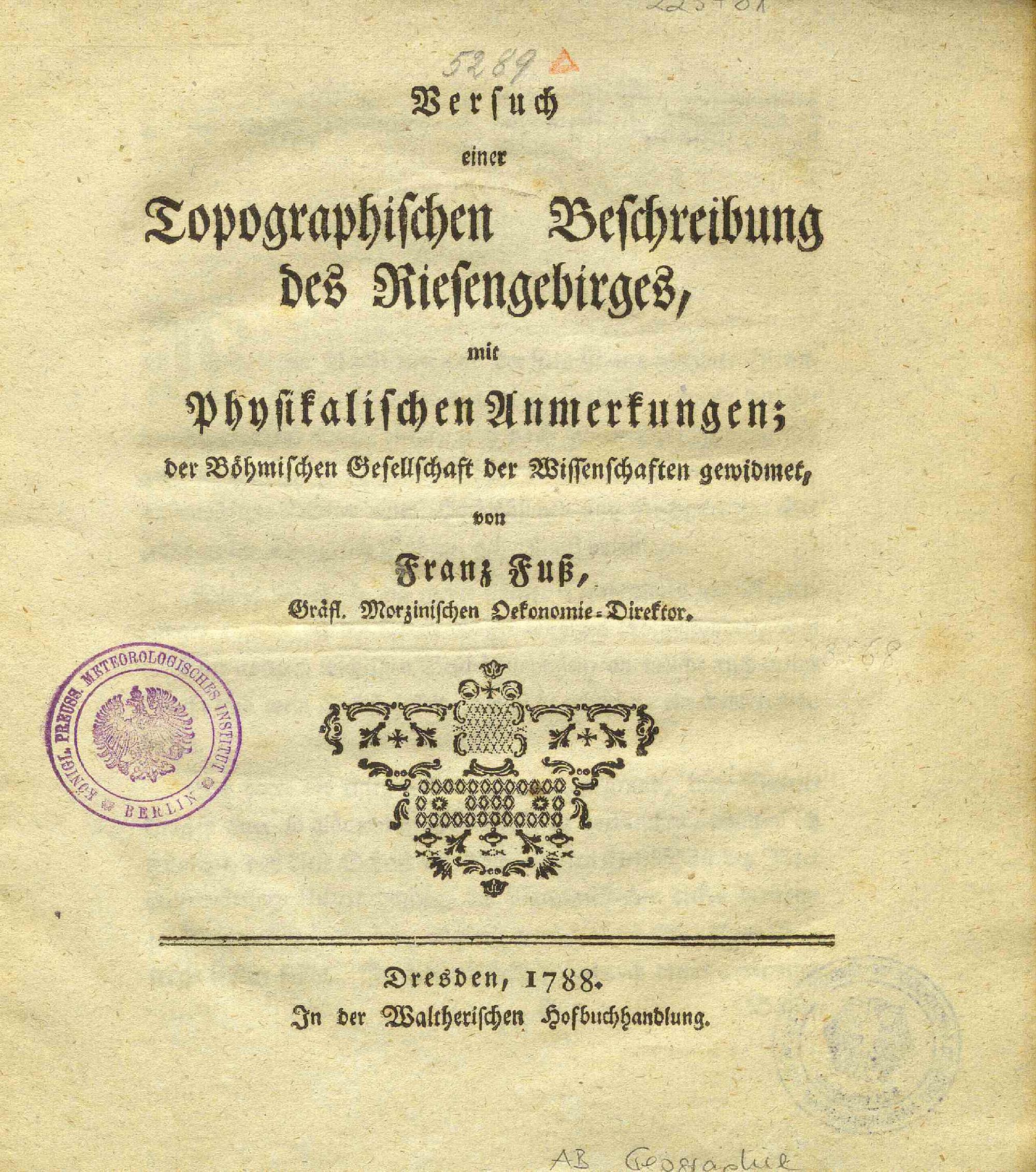 Versuch einer Topographischen Beschreibung des Riesengebirges : mit Physikalischen Anmerkungen; der Böhmischen Gesellschaft der Wissenschaften gewidmet / von Franz Fuß