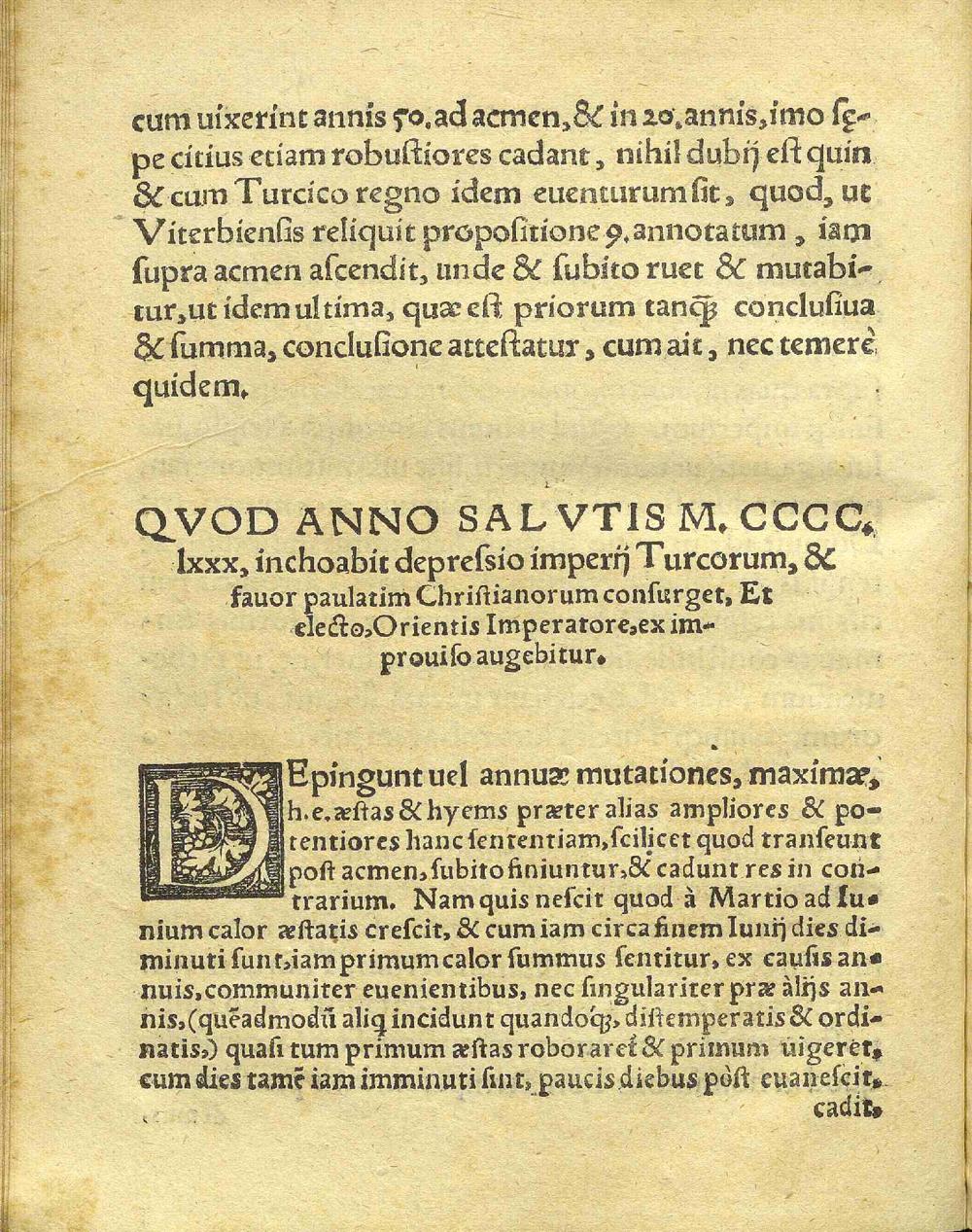 PROGNOSTICA || DE IMPERIIS CHRISTIA-||NO ET TVRCICO.|| Conscripta à quodam Ioanne Viter=||biensi, Magistro,|| Et || Edita ab eodem Noribergae || Anno Christi,|| 1471.|| Nunc iterum reperta, & in lucem edita,|| Ab Eras. Flockio Medic.|| Doctore.||