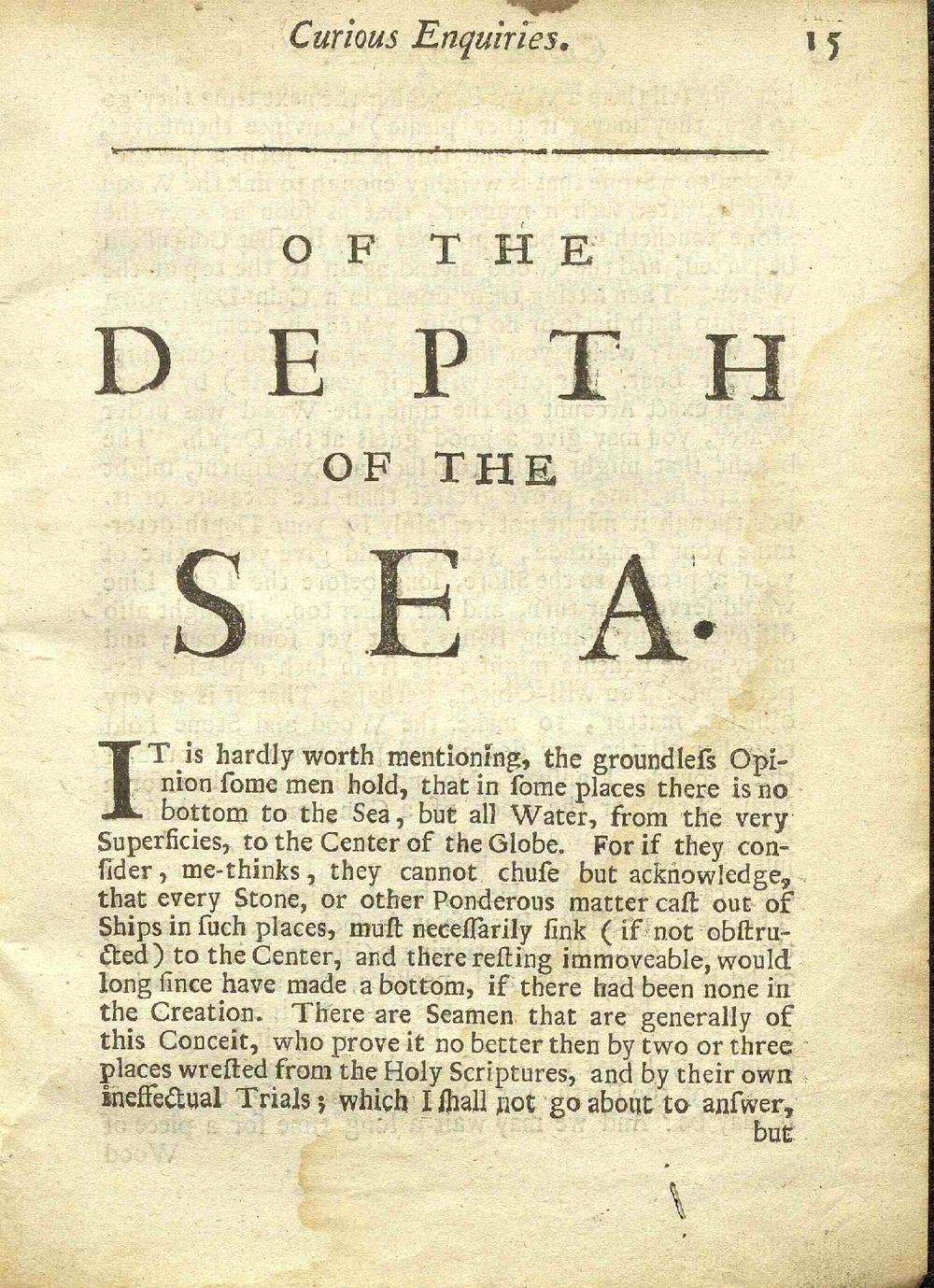 Curious Enquiries Being Six Brief Discourses : Viz. I. Of the Longitude, II. The Tricks of Astrological Quacks, III. Of the Depth of the Sea, IV. Of Tobacco, V. Of Europes being too full of People, VI. The various Opinions concerning the Time of Keeping the Sabbath