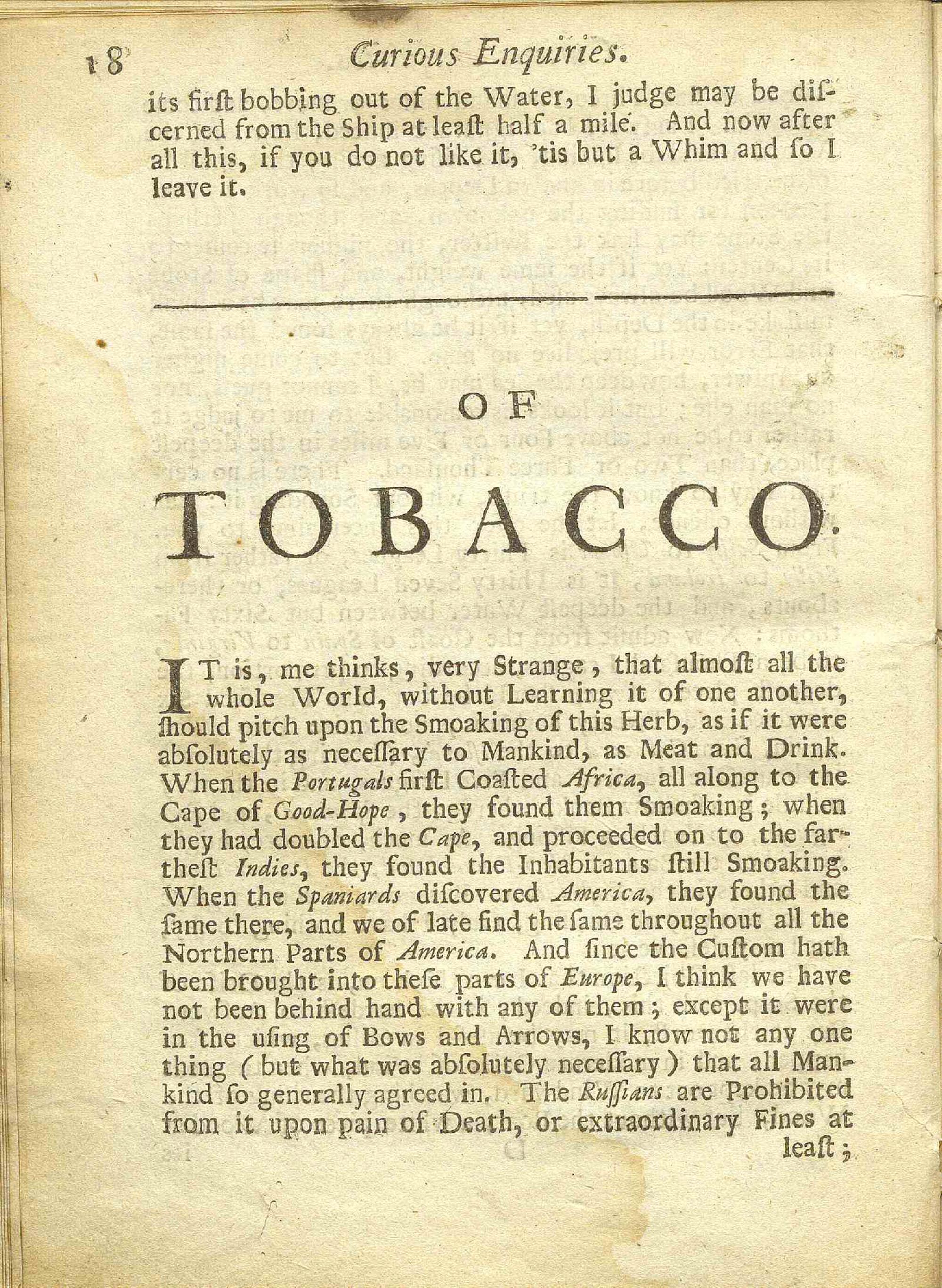 Curious Enquiries Being Six Brief Discourses : Viz. I. Of the Longitude, II. The Tricks of Astrological Quacks, III. Of the Depth of the Sea, IV. Of Tobacco, V. Of Europes being too full of People, VI. The various Opinions concerning the Time of Keeping the Sabbath