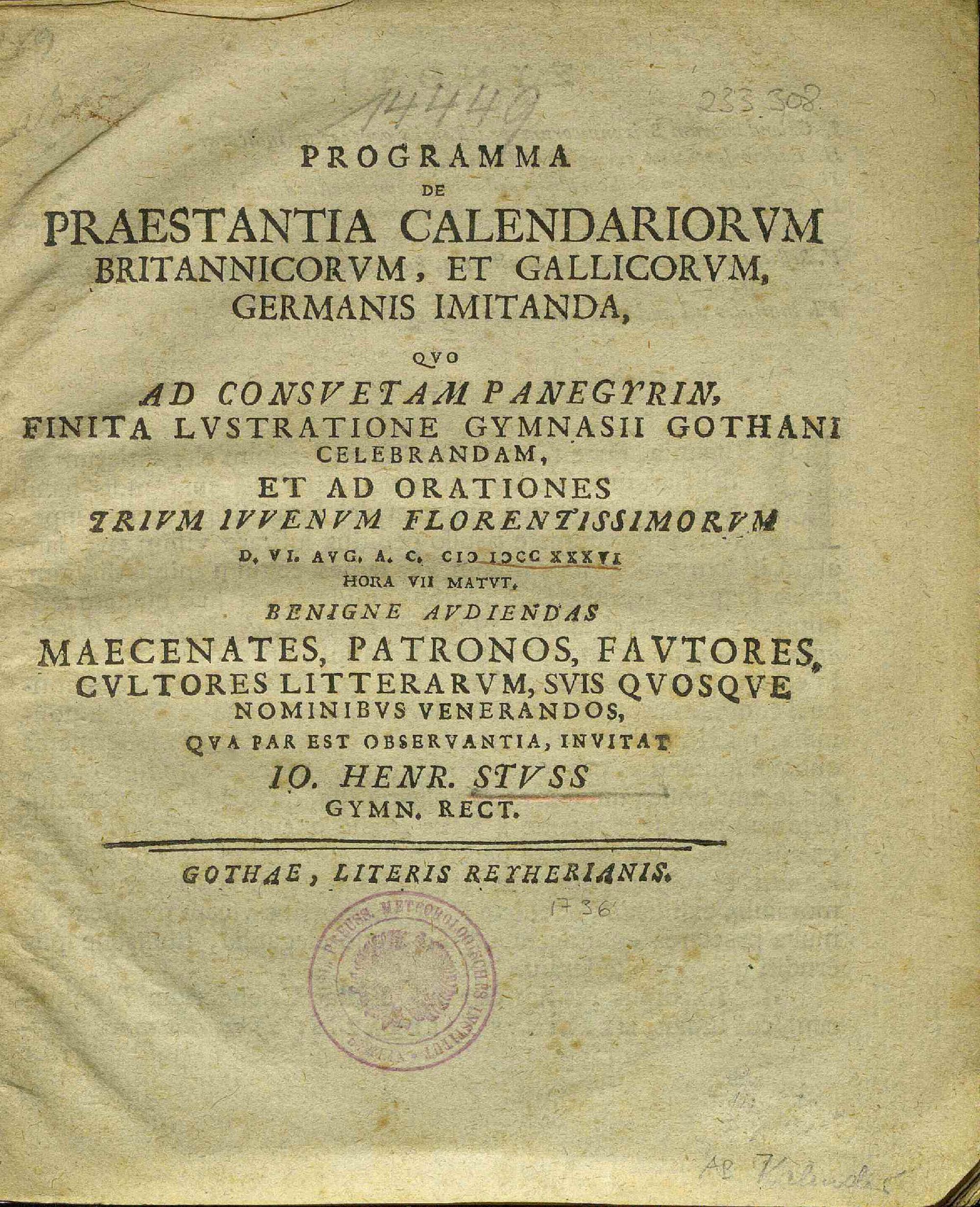 Programma De Praestantia Calendariorvm Britannicorvm, Et Gallicorvm, Germanis Imitanda : Qvo Consvetam Panegyrin, Finita Lvstratione Gymnasii Gothani Celebrandam, Et Ad Orationes Irivm Ivvenvm Florentissimorvm D. VI. Avg. A. C. MDCCXXXVI Hora VII Matvt, Benigne Avdiendas Maecenates, Patronos, Favtores, Cvltores Litterarvm, Svis Qvosqve Nominibvs Venerandos, Qva Par Est Observantia, Invitat / Io. Henr. Stvss, Gymn. Rect.
