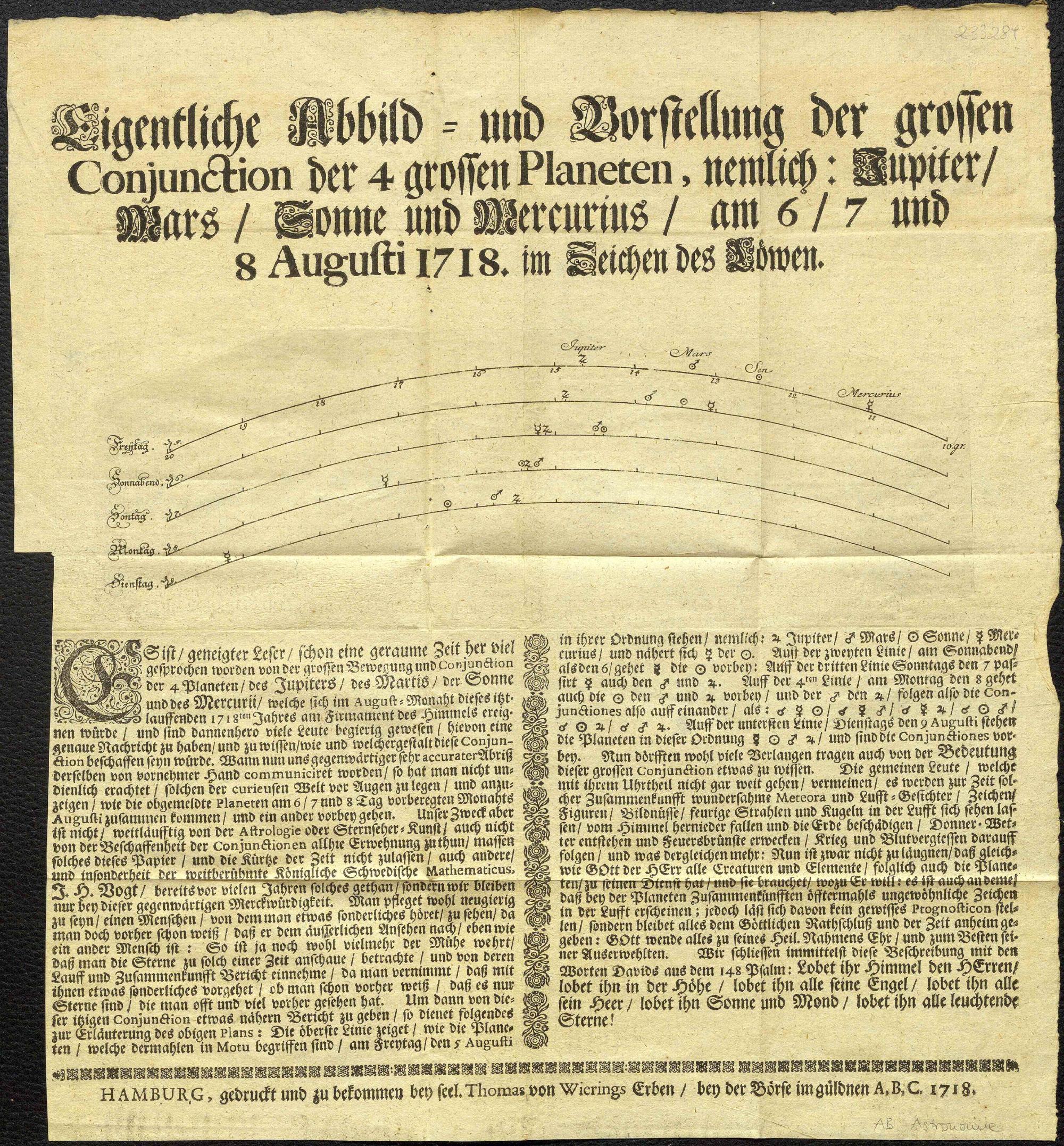 Eigentliche Abbild- und Vorstellung der grossen Conjunction der 4 grossen Planeten, nemlich: Jupiter, Mars, Sonne und Mercurius, am 6, 7 und 8 Augusti 1718. im Zeichen des Löwen