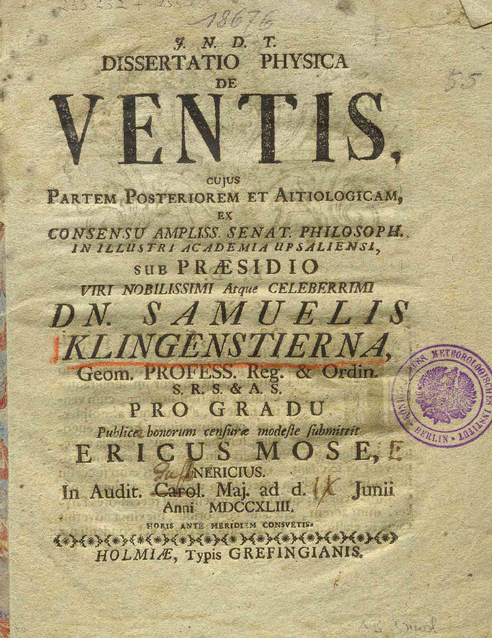 Cujus Partem Posteriorem Et Aitiologicam, Ex Consensu Ampliss. Senat. Philosoph. In Illustri Academia Upsaliensi / Sub Præsidio Viri Nobilissimi Atque Celeberrimi Dn. Samuelis Klingenstierna, Geom. Profess. Reg. & Ordin. S.R.S. & A.S. Pro Gradu Publice bonorum censuræ modeste submittit Ericus Mose, Nericus. In Audit. Carol. Maj. ad d. [XI] Junii Anni MDCCXLIII, Horis Ante Meridiem Consuetis