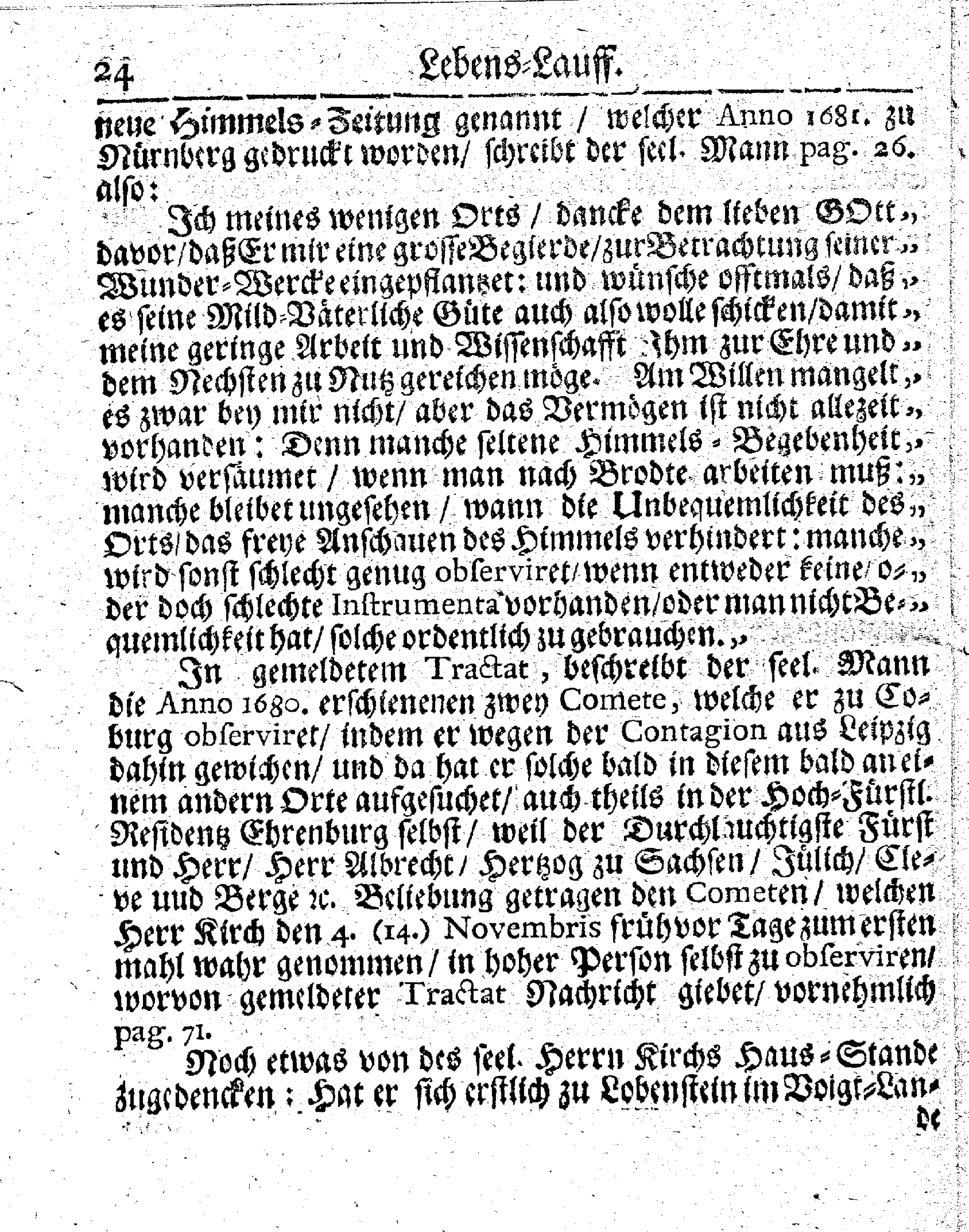 Die Stern-Kunst, Nach ihrem Mißbrauch und rechten Gebrauch, Wolte, Als der Wohl-Edle und Wohlgelahrte Herr, Herr Gottfried Kirch, Astronomus ordinarius bey der Kön. Preuß. Societät der Wissenschafften, Den 25sten Julii 1710 seelig verschieden, und darauff den 29ten bey ansehnlichem Leichen-Conduct christlich zur Erden bestattet wurde : in einer Stand-Rede kürtzlich betrachten, und auff Begehren dem Druck übergeben / Johann Gustav Reinbeck