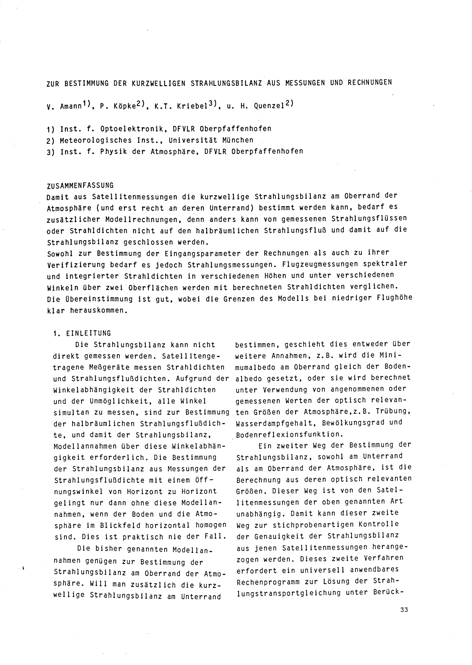 Zur Bestimmung der kurzweIligen Strahlungsbilanz aus Messungen und Rechnungen ...