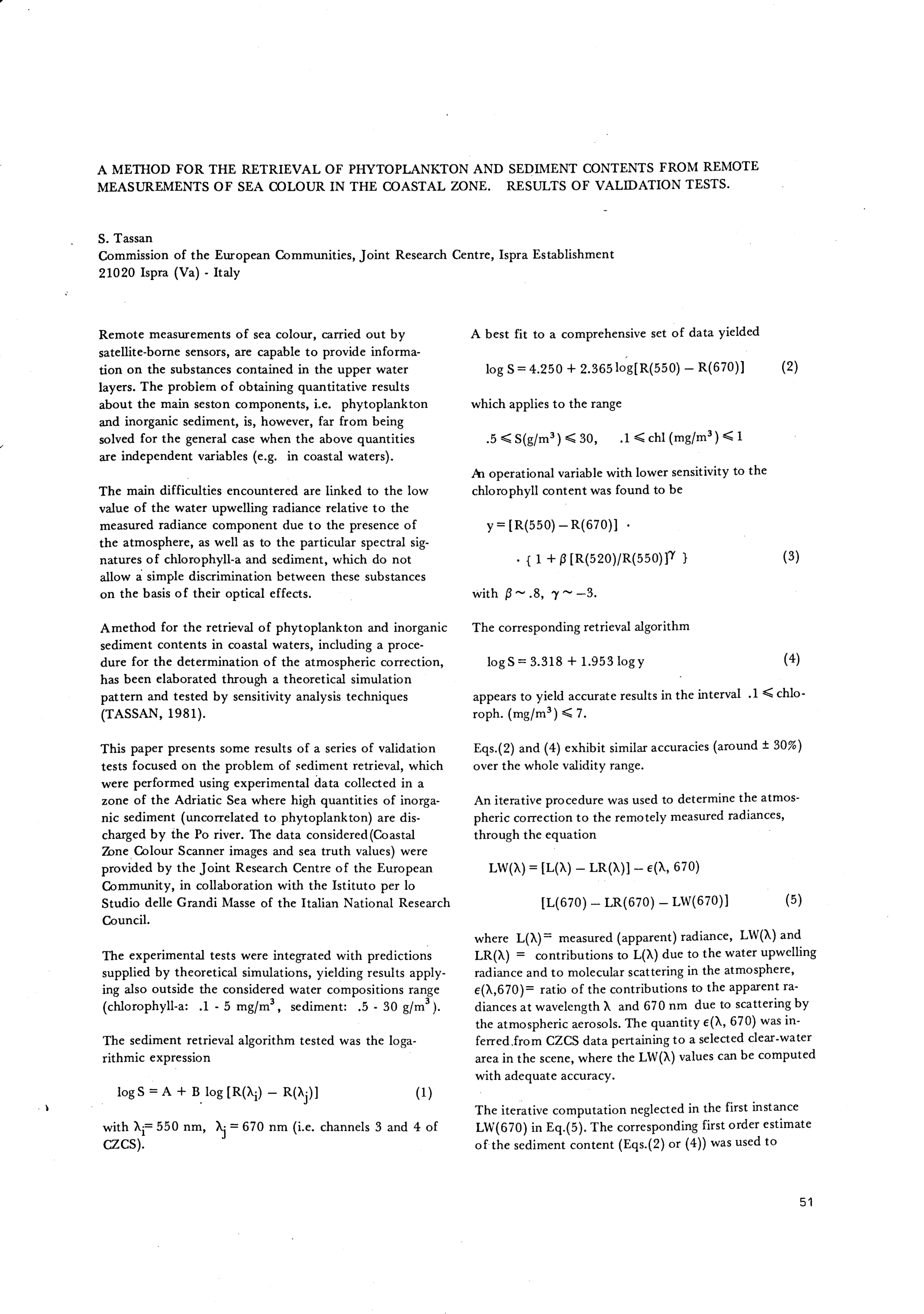 A method for the retrieval of phytoplankton and sediment contents from remote measurements...