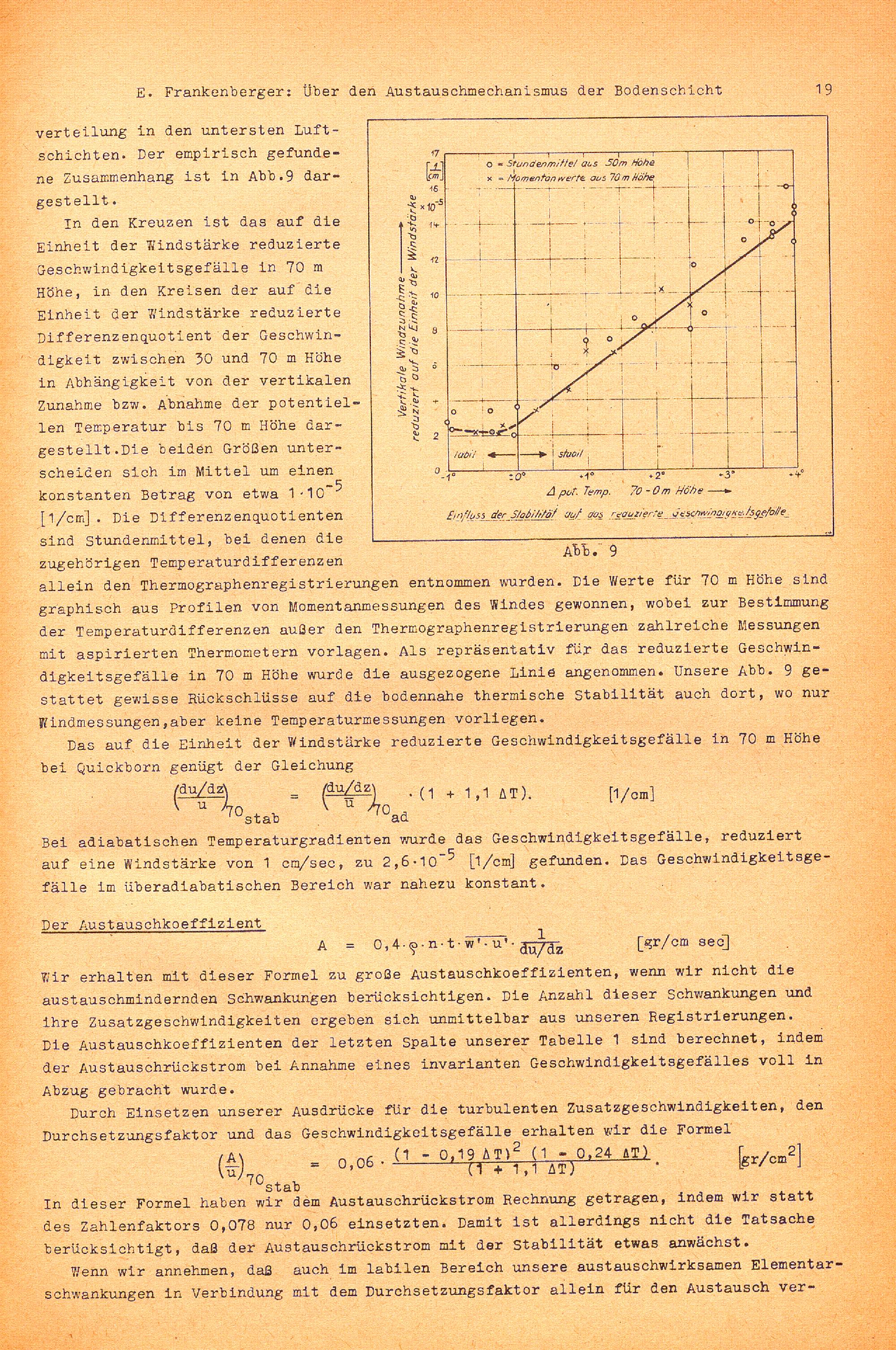 Über den Austauschmechanismus der Bodenschicht und die Abhängigkeit des vertikalen Massenaustausches vom Temperaturgefälle nach Untersuchungen an den 70 m hohen Funkmasten in Quickborn/Holstein / von Dr. E. Frankenberger, Hamburg
