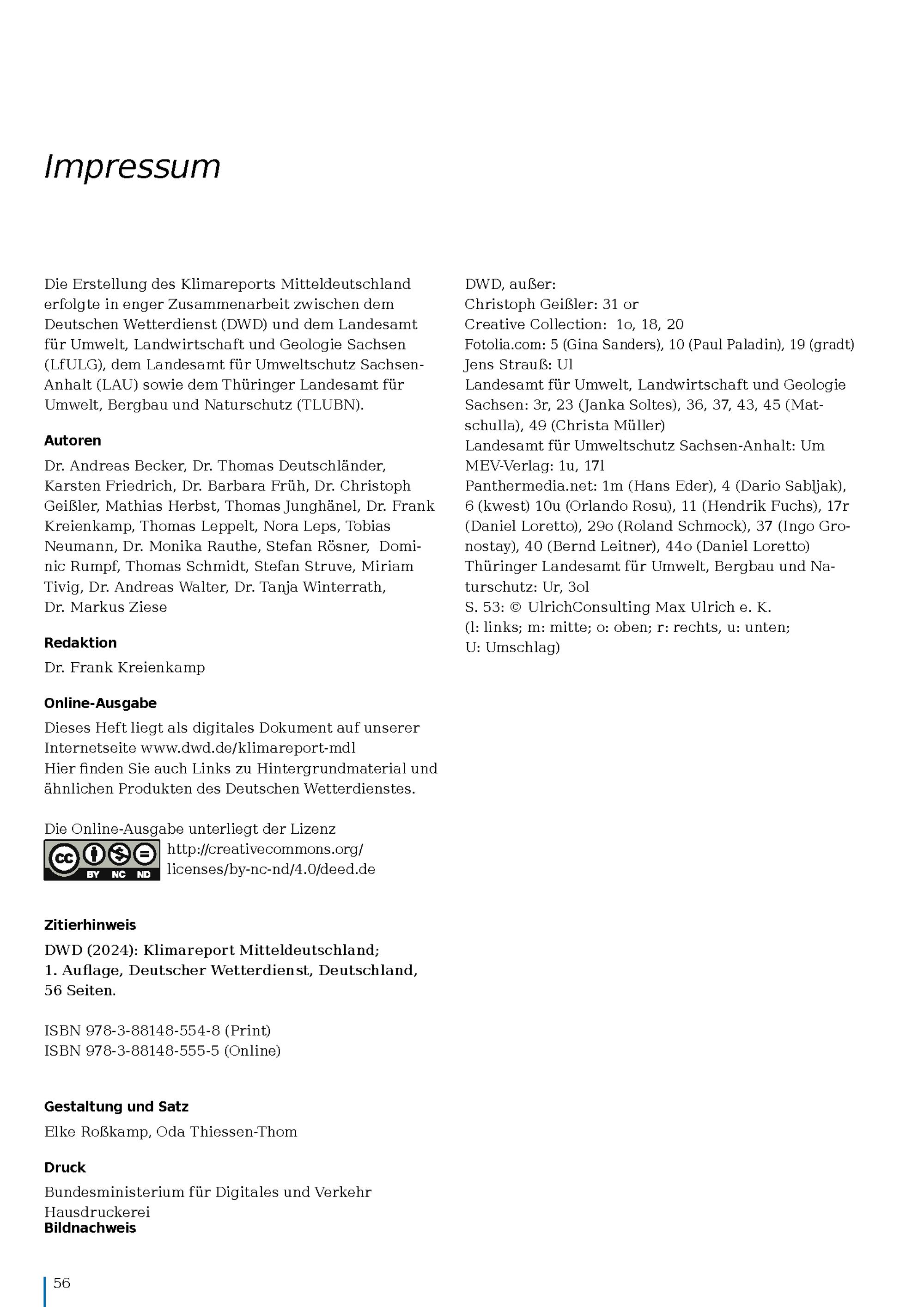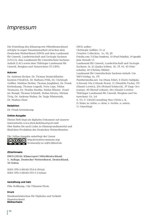 Klimareport Mitteldeutschland : Klima - gestern, heute in der Zukunft / Deutscher Wetterdienst, Landesamt für Umwelt, Landwirtschaft und Geologie Sachsen (LfULG), Landesamt für Umweltschutz Sachsen-Anhalt (LAU), Thüringer Landesamt für Umwelt, Bergbau und Naturschutz (TLUBN) ; Autoren: Dr. Andreas Becker, Dr. Thomas Deutschländer, Karsten Friedrich, Dr. Barbara Früh, Dr. Christoph Geißler, Mathias Herbst, Thomas Junghänel, Dr. Frank Kreienkamp, Thomas Leppelt, Nora Leps, Tobias Neumann, Dr. Monika Rauthe, Stefan Rösner, Dominic Rumpf, Thomas Schmidt, Stefan Struve, Miriam Tivig, Dr. Andreas Walter, Dr. Tanja Winterrath, Dr. Markus Ziese