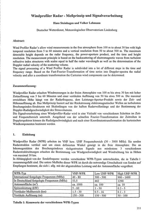 Steinhagen, H.; Lehmann,V.: Windprofiler Radar-Meßprinzip und Signalverarbeitung