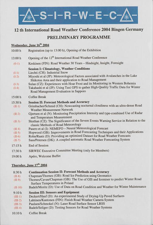 SIRWEC 2004 : 12th International Road Weather Conference, 16th - 18th June 2004, Bingen (on Rhine), Germany