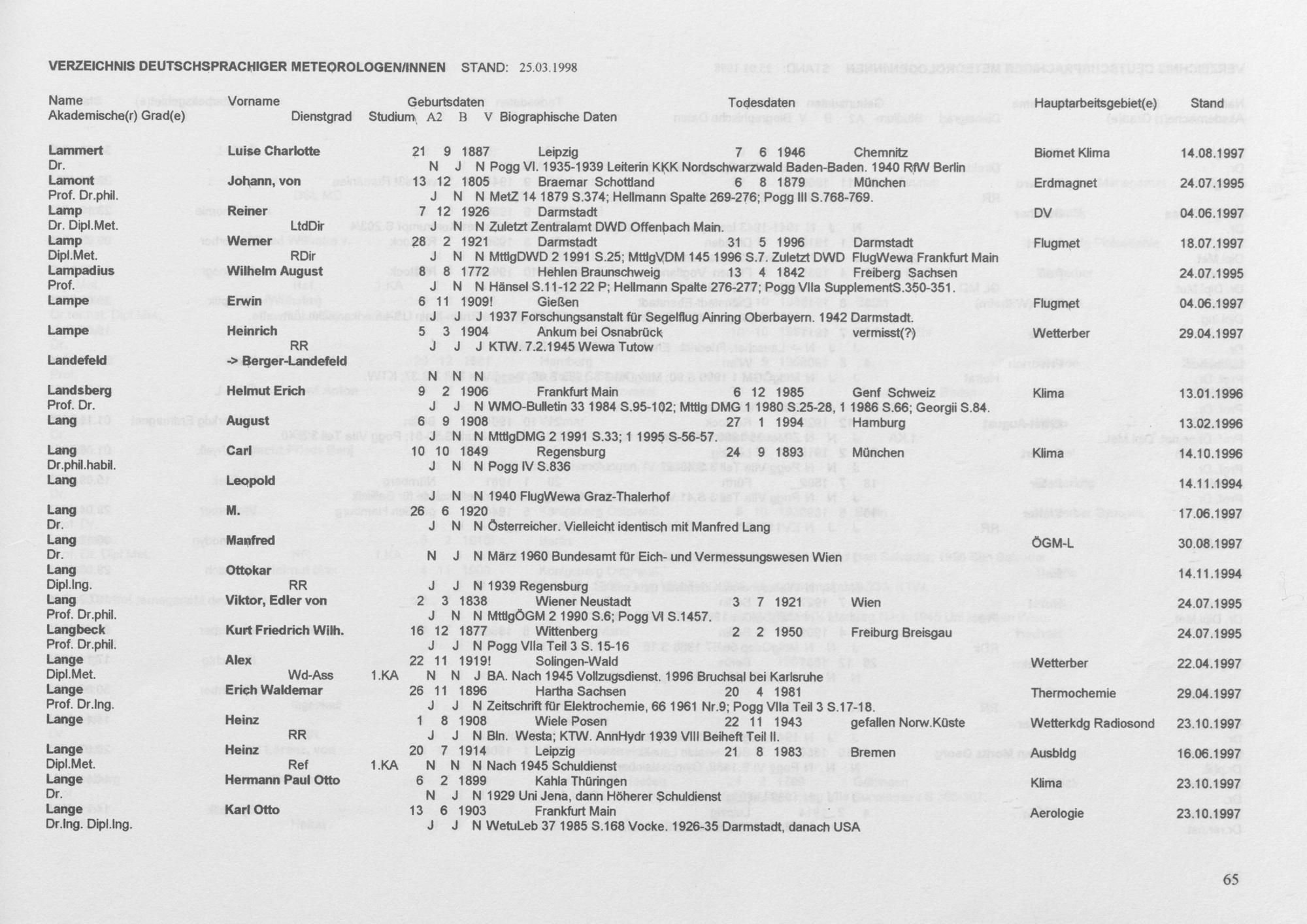 Meteorologen und Meteorologinnen aus dem deutschen Sprachraum : ein biographisches Findbuch ; Auszug aus der Wolfgang-von-Bezold-Sammlung der Deutschen Meteorologischen Gesellschaft e. V. / zsgest. von Rudolf F. Paulus ; ...