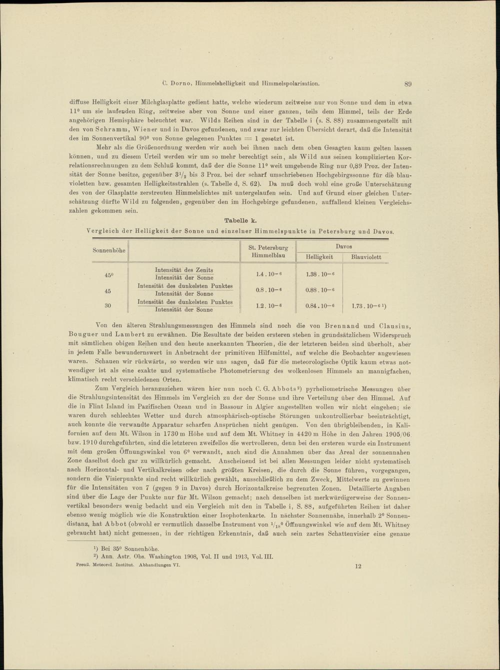 Himmelshelligkeit, Himmelspolarisation und Sonnenintensität in Davos 1911 - 1918