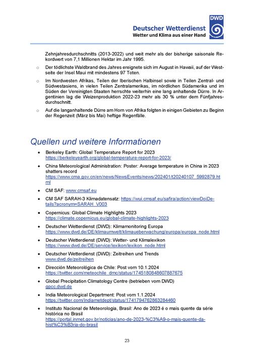 Klimatologischer Rückblick auf 2023: Das bisher wärmste Jahr in Deutschland / Autoren: K. Friedrich, D. Niermann, F. Imbery, P. Bissolli, J. Daßler, V. Zins, S. Haeseler, M. Ziese ; Deutscher Wetterdienst