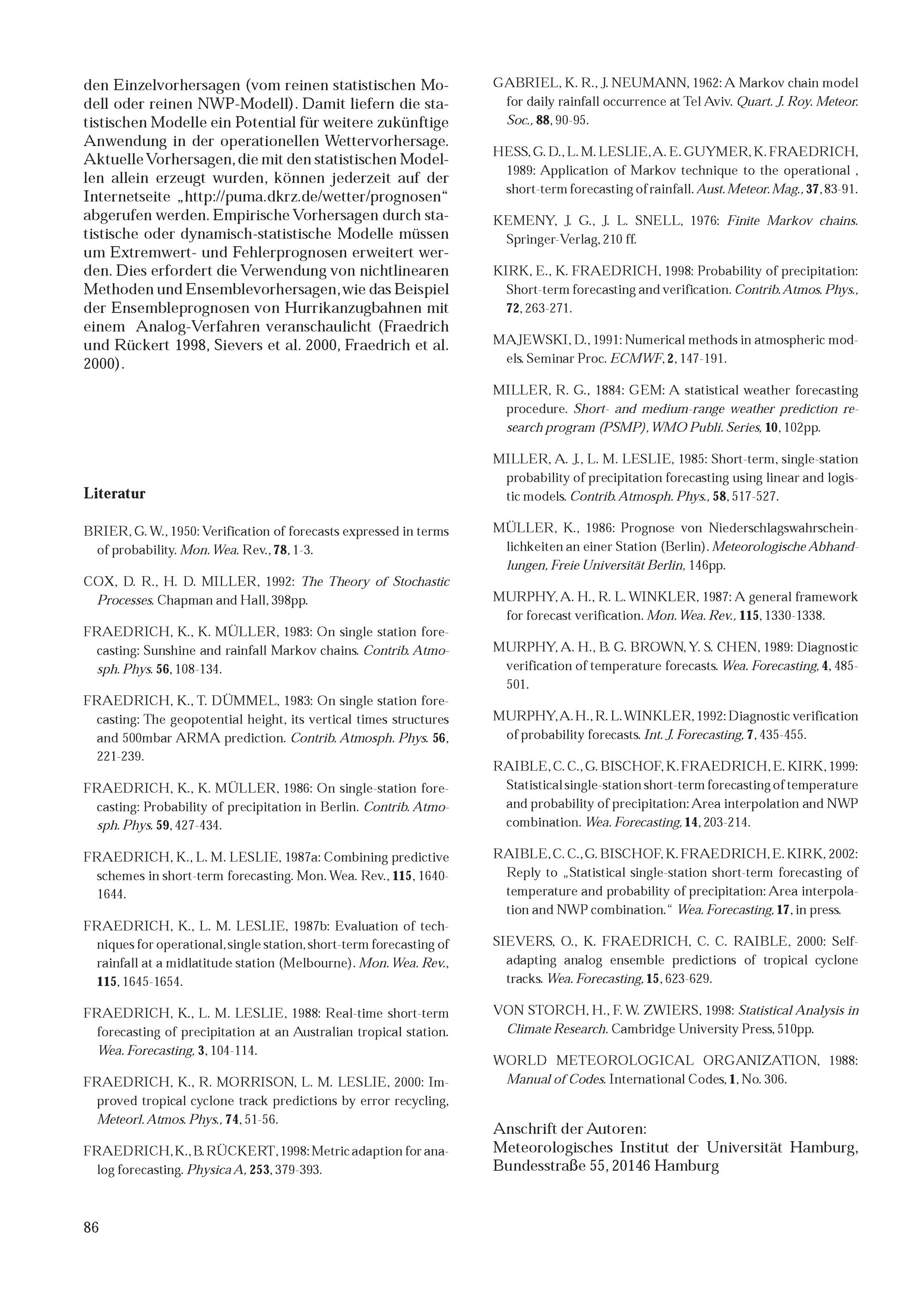C. C. Raible, E. Kirk, K. Fraedrich: Kurzfristvorhersagen von Niederschlagswahrscheinlichkeit und Temperatur