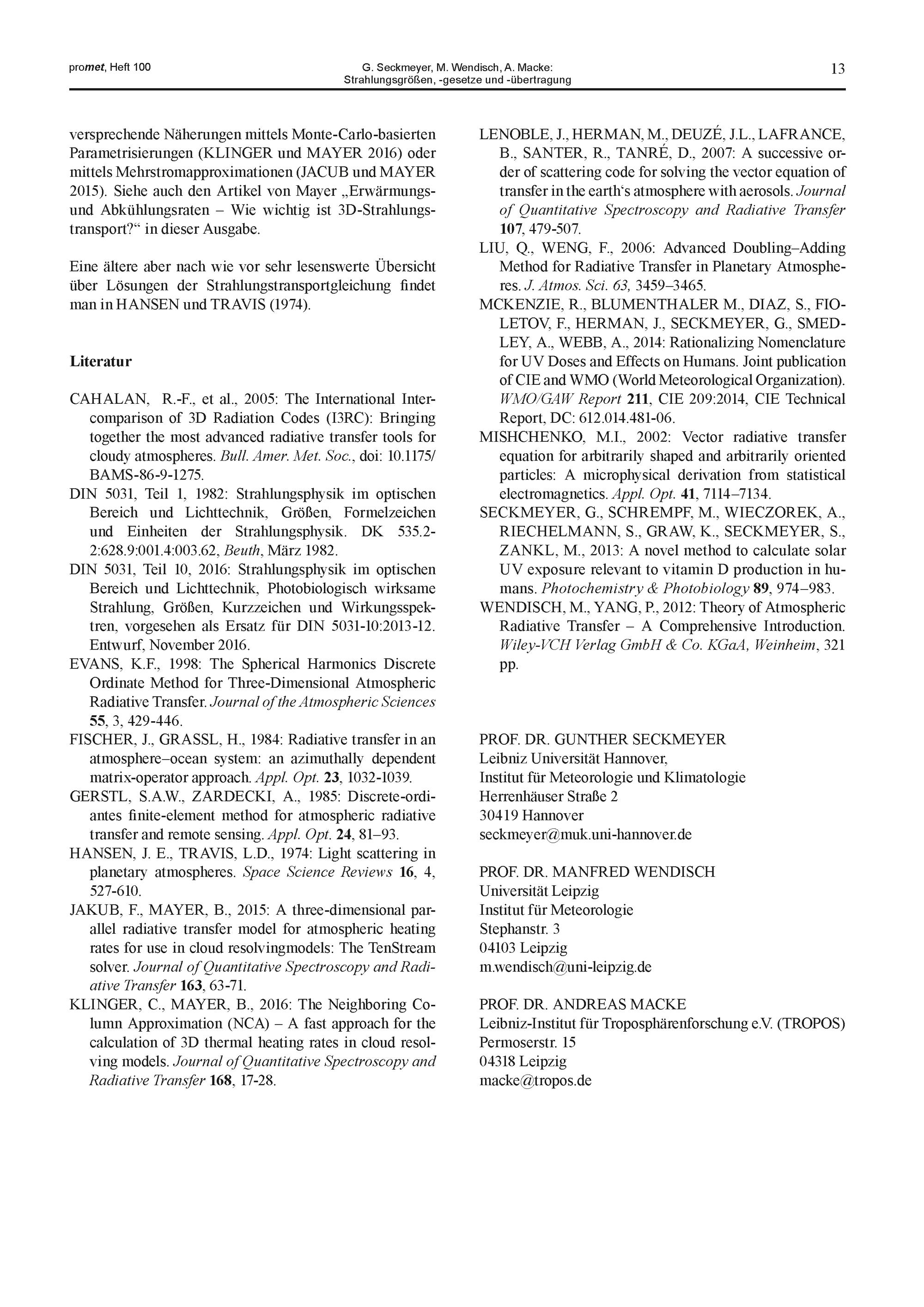 1. G. Seckmeyer, M. Wendisch, A. Macke: Strahlungsgrößen, -gesetze und -übertragung