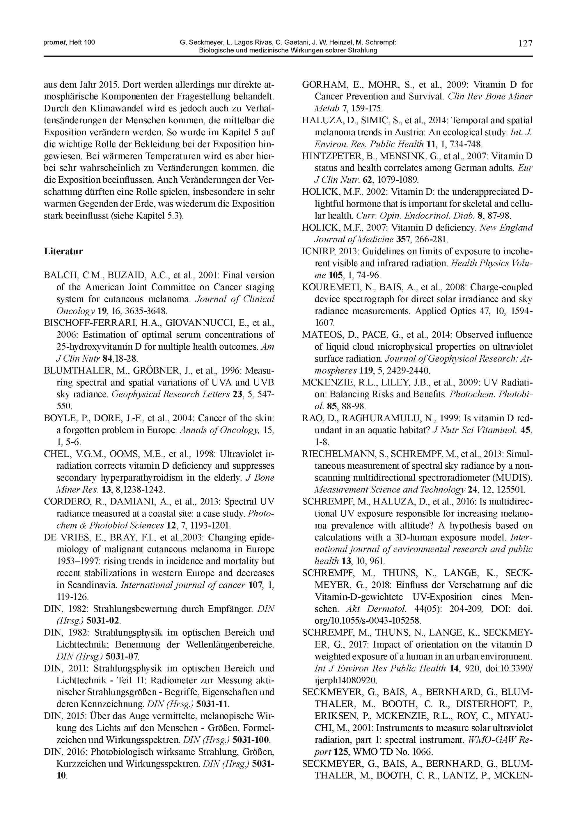 13. G. Seckmeyer, L. Lagos Rivas, C. Gaetani, J. W. Heinzel, M. Schrempf: Biologische und medizinische Wirkungen solarer Strahlung