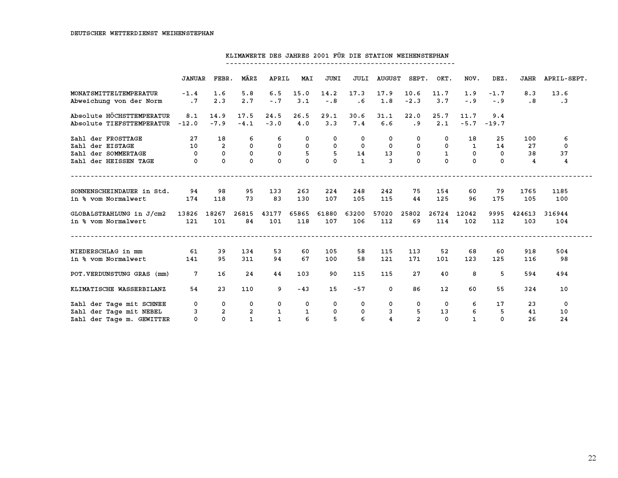 Klimawerte des Jahres 2001 für die Station Weihenstephan