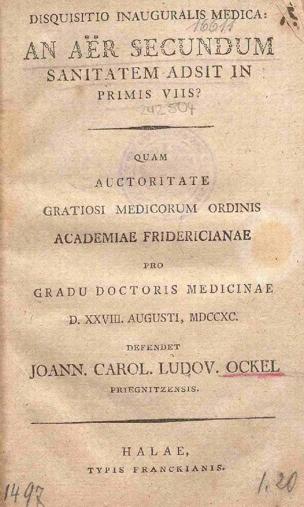 - TitelDisquisitio Inauguralis Medica: An Aër Secundum Sanitatem Adsit In Primis Viis? / Quam Auctoritate Gratiosi Medicorum Ordinis Academiae Fridericianae Pro Gradu Doctoris Medicinae D. XXVIII. Augusti, MDCCXC. Defendet Joann. Carol. Ludov. Ockel, Priegnitzensis.