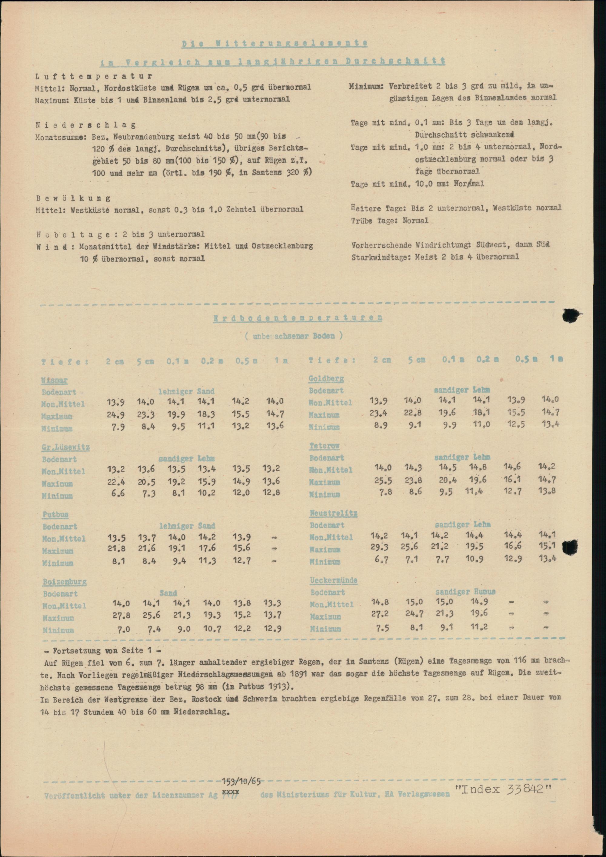 Witterungsübersicht für die Bezirke Rostock, Schwerin und Neubrandenburg