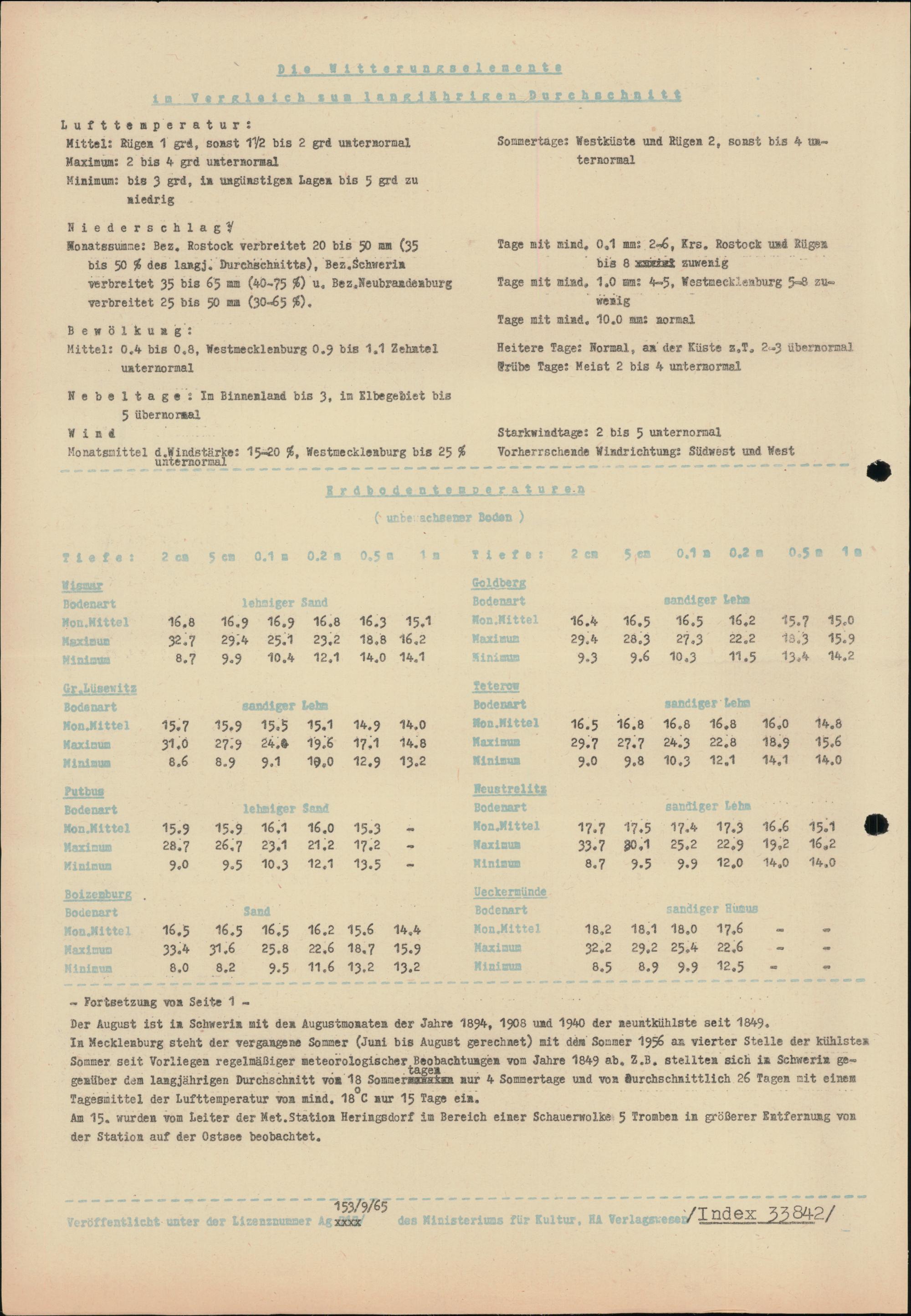 Witterungsübersicht für die Bezirke Rostock, Schwerin und Neubrandenburg