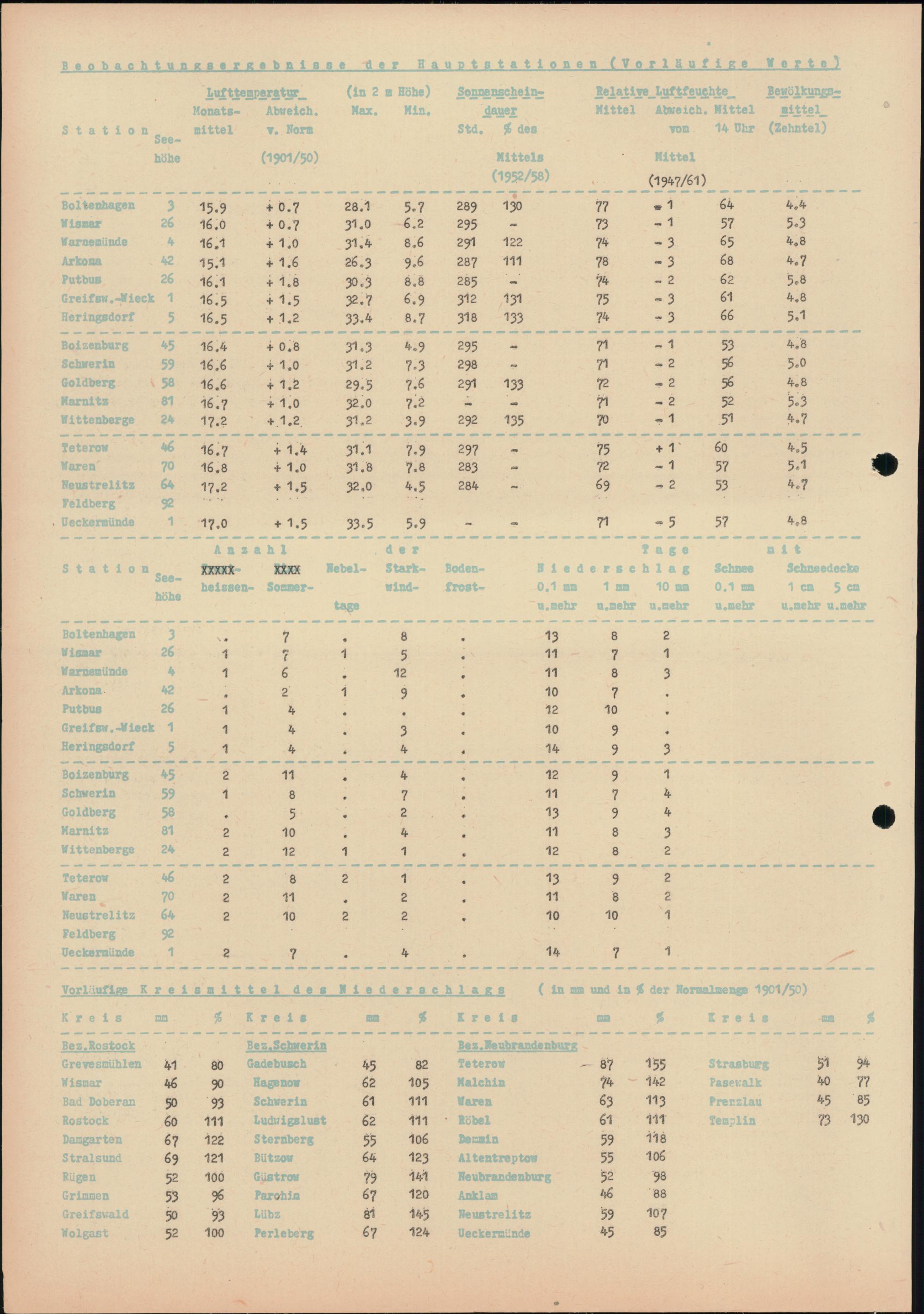 Witterungsübersicht für die Bezirke Rostock, Schwerin und Neubrandenburg