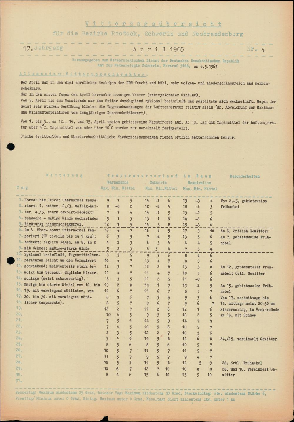 Witterungsübersicht für die Bezirke Rostock, Schwerin und Neubrandenburg